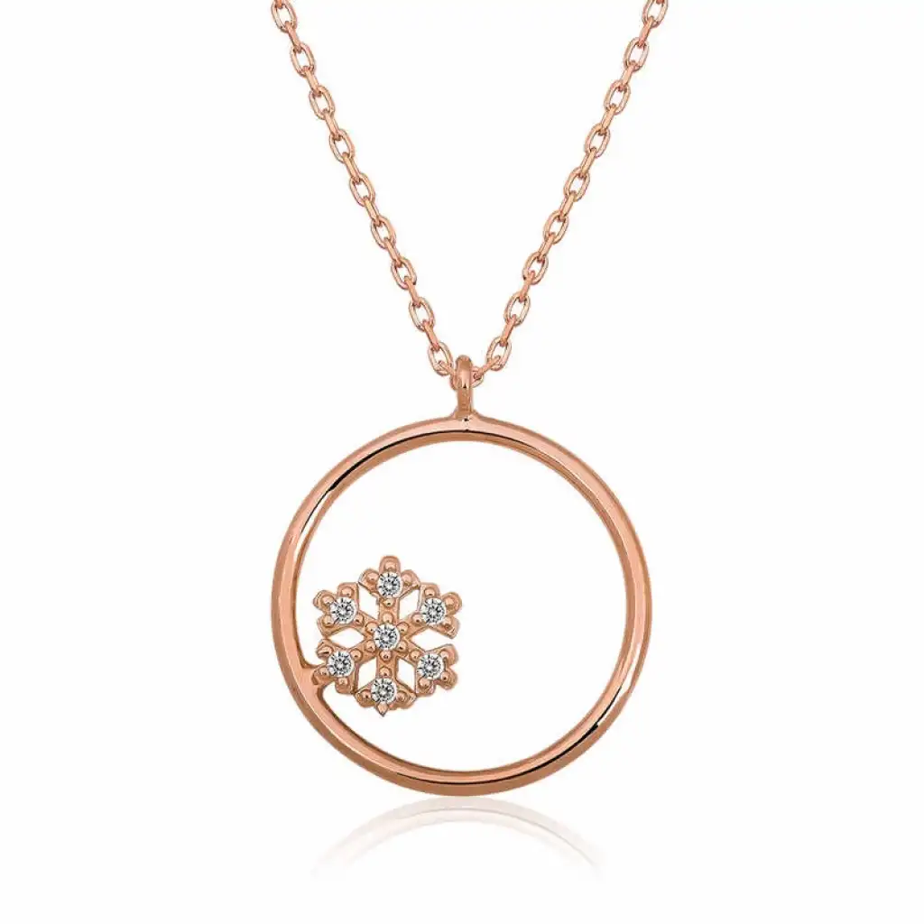 Kadınların ışıltısı, berraklığı kar tanesine benzetilip özel olarak tasarlanmıştır. Kar tanelerinin her birinin bayanlar gibi eşsiz ve ayrı kıymette olması onları özel kılan bir diğer özelliktir. Asilliği her dönemde dikkat çekmeyi başarmıştır. Bunun yanında insanların tıpkı kar taneleri gibi birbirlerine zarar vermeden de mutlu bir şekilde yaşayabileceklerini sembolize etmektedir. Bu şık kar tanesi halka detaylı kolye; doğum günü hediyesi, sevgililer günü hediyesi veya annelere hediye olarak özel günlerde tercih edilebilecek mükemmel bir seçenektir. Kolye, 925 ayar gümüşten imal edilmiştir. Gümüş üzerine rose altın kaplama yapılmıştır. Rose altın kaplama yapılan ürünler parlaklığını uzun süre muhafaza eder, gümüşü pembe renge dönüştürür ve oksitlenmesi gecikir. Tüm gümüş bayan kolyelerde olduğu gibi bu gümüş kar tanesi detaylı halka kolye de tamamı el emeği ile üretilmiştir. Gümüş ve değerli taşlar nedeniyle belirtilen ortalama ürün ağırlığında ± %10 sapma olabilmektedir.