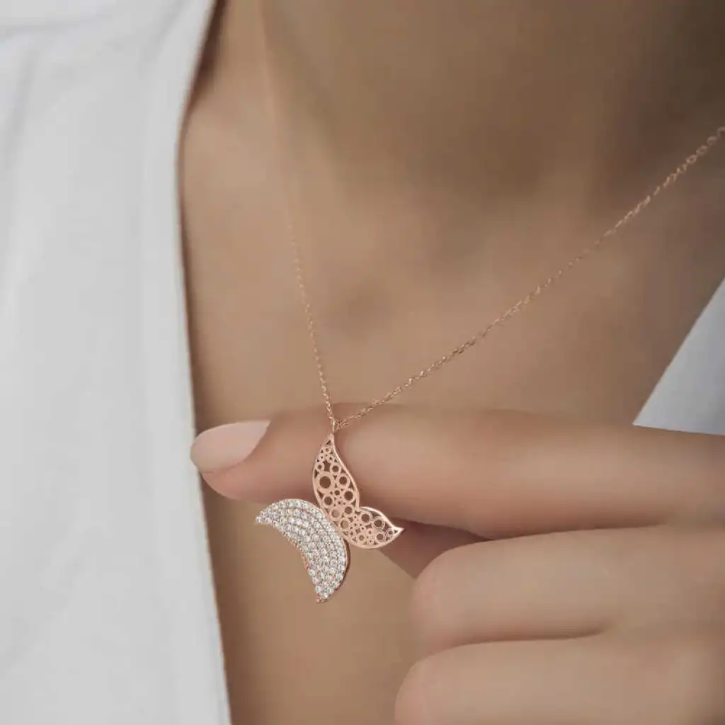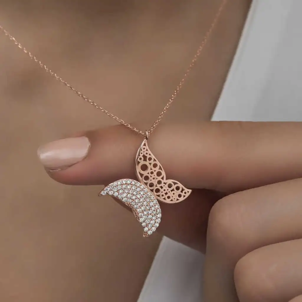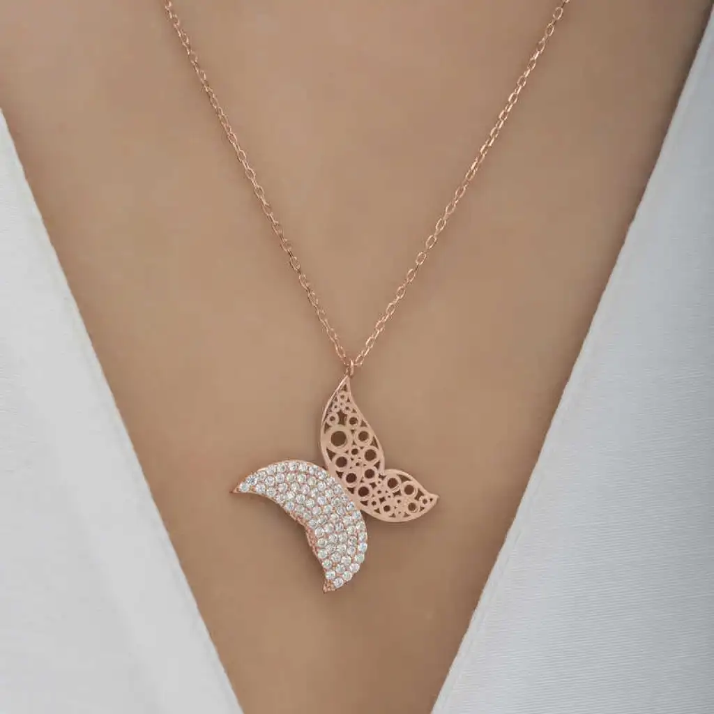 Kelebek; kadınlarca tercih edilen en popüler motiflerden biridir. Sevenlerine doğanın gizemini ve insan hayal gücünün zenginliğini hatırlatır. Özgürlüğü masumiyeti ve saflığı simgeleyen kelebekler, tertemiz sevginin ve aşkın ifadesidir. Sizin olduğu kadar sevdiklerinizin de keyifle takacağı kelebek kadın kolye, sevdiğinize en güzel hediyelerden biri olacaktır. Kolye 925 ayar gümüşten imal edilmiştir. Gümüş üzerine rose kaplama yapılmıştır. Rose kaplama yapılan gümüş kadın kolyeler parlaklığını uzun süre muhafaza eder ve oksitlenmesini geciktirir. Gümüş olan zincir boyu ortalama 45 cm'dir. Tüm gümüş kadın kolyelerde olduğu gibi gümüş kelebek kadın kolye modeli de el emeği ile üretilmiştir. Gümüş ve değerli taşlar nedeniyle belirtilen ortalama ürün ağırlığında ± %10 sapma olabilmektedir.