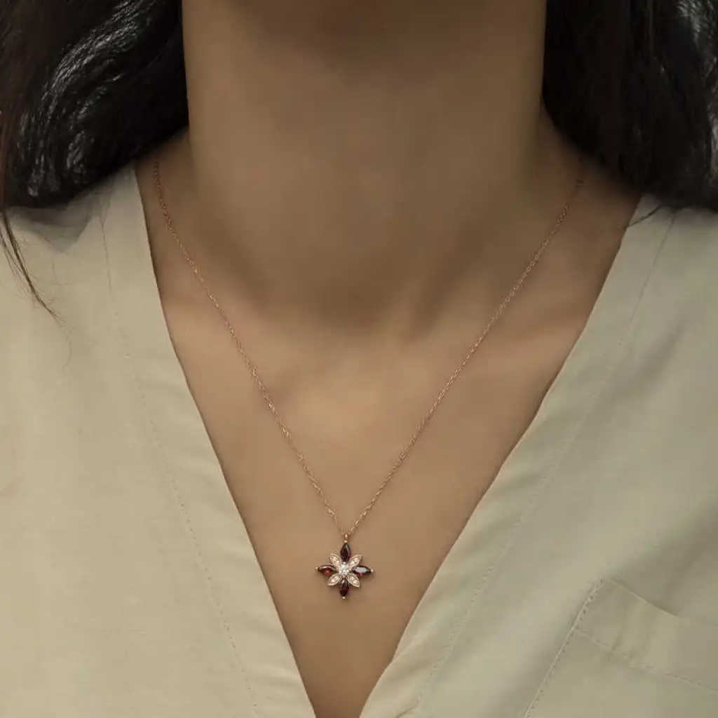 Gümüş Rose Kırmızı Taşlı Umut Çiçeği Kolye