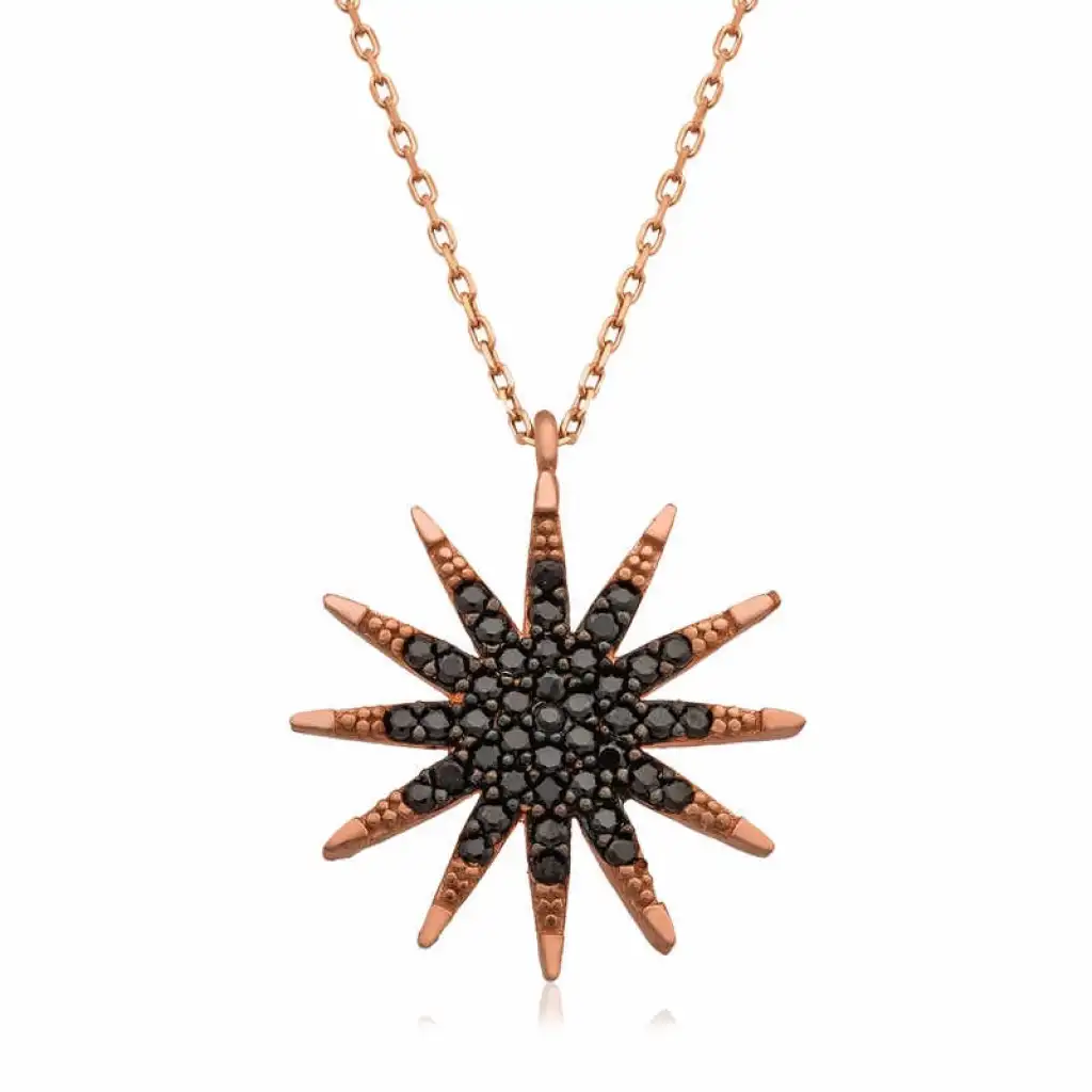Genç ve dinamik bir çizgiye sahip olmak isteyenlerin tercih edeceği, siyah taşlı kutup yıldızı bayan kolye ile tarzınızı yansıtın. Sizin olduğu kadar sevdiklerinizin de keyifle takacağı bu gümüş kolye modeli sevdiğinize en güzel hediyelerden biri olacaktır. Siyah taşlı kutup yıldızı bayan kolye 925 ayar gümüşten imal edilmiştir. Gümüş üzerine rose altın kaplama yapılmıştır. Rose altın kaplama yapılan gümüş bayan kolye modelleri parlaklığını uzun süre muhafaza eder ve oksitlenmesi gecikir. Kolye üzerinde bulunan taşlar zirkondur. Gümüş olan zincir boyu ortalama 45 cm'dir. Bu zirkon taşlı kutup yıldızı bayan kolye diğer tüm gümüş bayan kolye modellerinde olduğu gibi el emeği ile üretilmiştir. Gümüş ve değerli taşlar nedeniyle belirtilen ürün ağırlığında ± %10 sapma olabilmektedir.