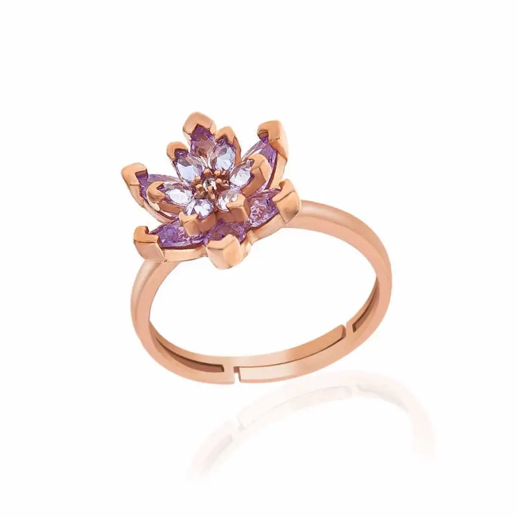 Gümüş Rose Ayarlanabilen Lila Taşlı Lotus Çiçeği Kadın Yüzük