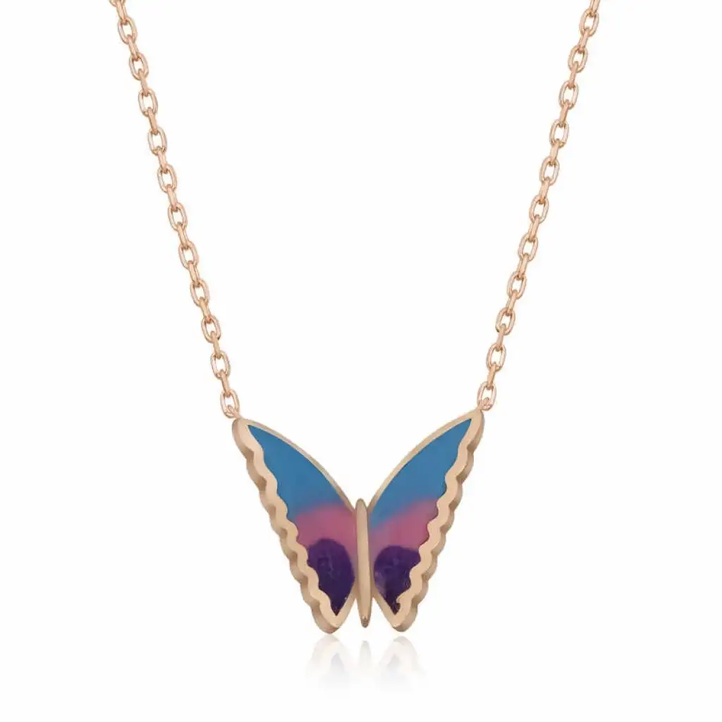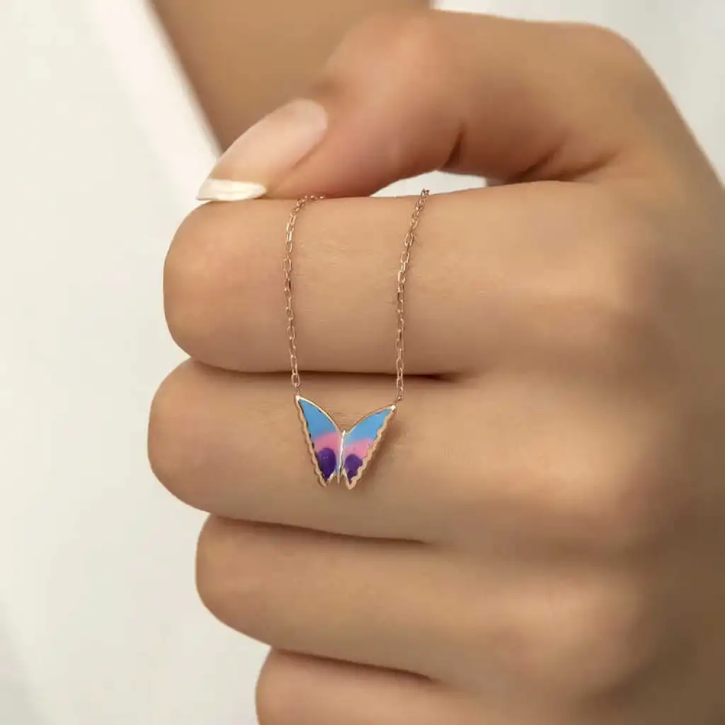 Özgürlüğü masumiyeti ve saflığı simgeleyen kelebekler, tertemiz sevginin ve aşkın ifadesidir. Bahar kelebekleri kolye anlam itibari ile aşkın küçük bir kıvılcım ile başladığı daha sonra büyük bir sabır ile büyüdüğü ve en sonunda ilan-ı aşkı ifade eder. Sizin olduğu kadar sevdiklerinizin de keyifle takacağı minimal kelebek bayan kolye en güzel hediyelerden biri olacaktır. Kolye 925 ayar gümüşten imal edilmiştir. Gümüş üzerine rose kaplama yapılmıştır. Rose kaplama yapılan gümüş bayan kolyeler parlaklığını uzun süre muhafaza eder, ve oksitlenmeyi geciktirir. Kolye üzerinde bulunan renkler mine işlemesidir. Gümüş olan zincir boyu ortalama 45 cm'dir. Tüm gümüş bayan kolyelerde olduğu gibi gümüş minimal kelebek bayan kolye de el emeği ile üretilmiştir. Gümüş ve değerli taşlar nedeniyle belirtilen ürün ağırlığında ± %10 sapma olabilmektedir.