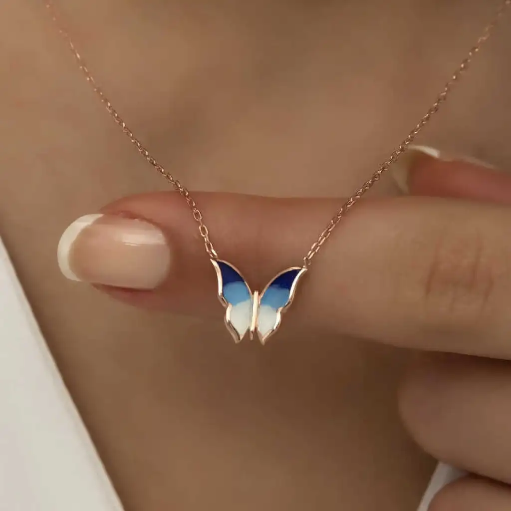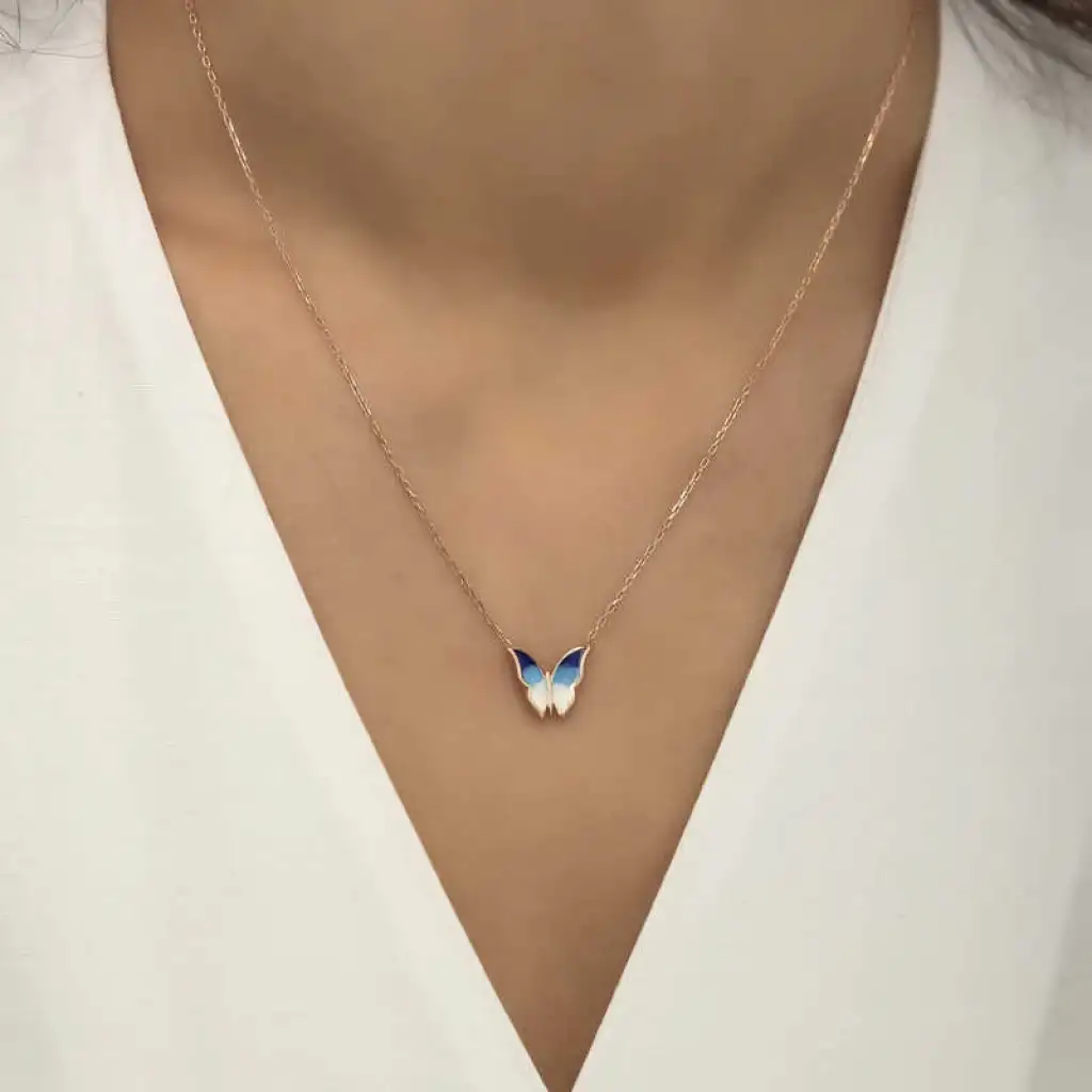 Özgürlüğü masumiyeti ve saflığı simgeleyen kelebekler, tertemiz sevginin ve aşkın ifadesidir. Bahar kelebekleri kolye anlam itibari ile aşkın küçük bir kıvılcım ile başladığı daha sonra büyük bir sabır ile büyüdüğü ve en sonunda ilan-ı aşkı ifade eder. Sizin olduğu kadar sevdiklerinizin de keyifle takacağı minimal kelebek bayan kolye en güzel hediyelerden biri olacaktır. Kolye 925 ayar gümüşten imal edilmiştir. Gümüş üzerine rose kaplama yapılmıştır. Rose kaplama yapılan gümüş bayan kolyeler parlaklığını uzun süre muhafaza eder, ve oksitlenmeyi geciktirir. Kolye üzerinde bulunan renkler mine işlemesidir. Gümüş olan zincir boyu ortalama 45 cm'dir. Tüm gümüş bayan kolyelerde olduğu gibi gümüş minimal kelebek bayan kolye de el emeği ile üretilmiştir. Gümüş ve değerli taşlar nedeniyle belirtilen ürün ağırlığında ± %10 sapma olabilmektedir.