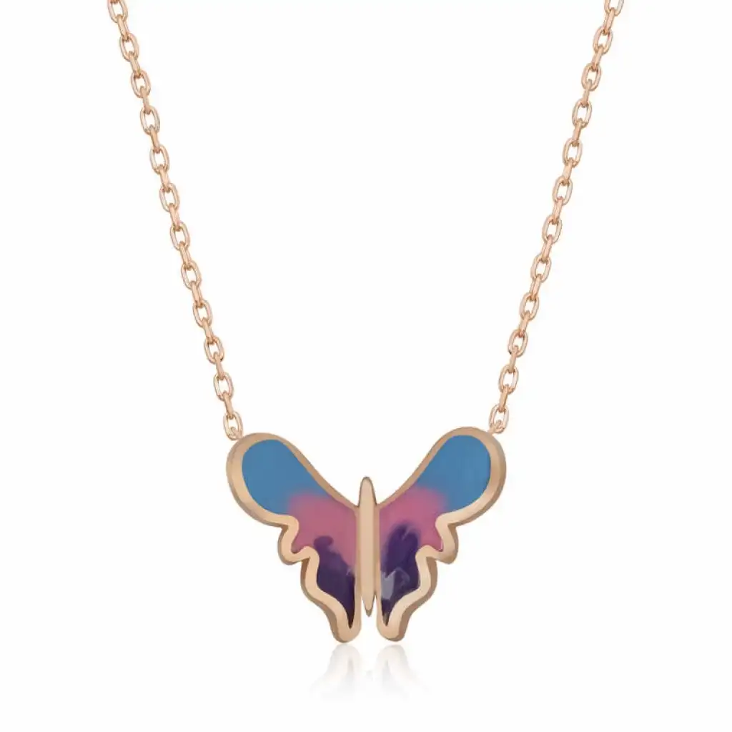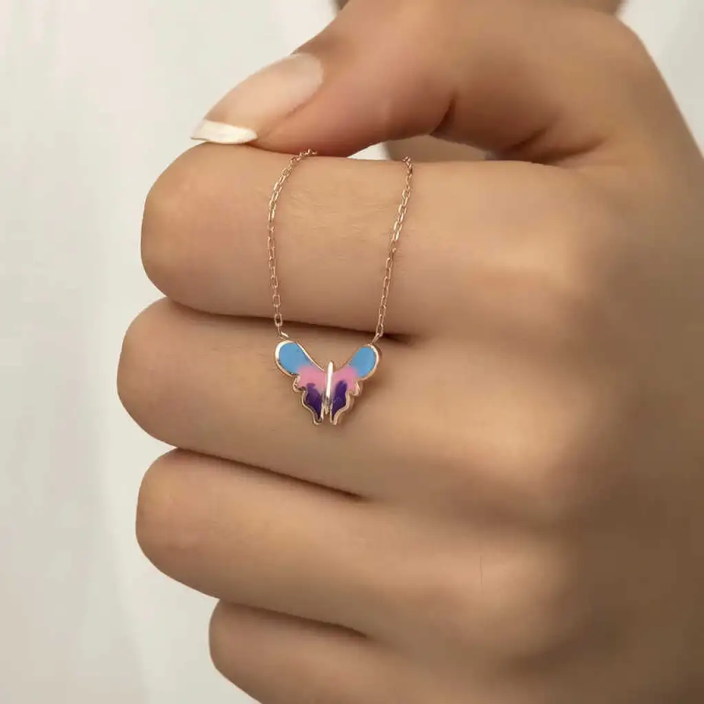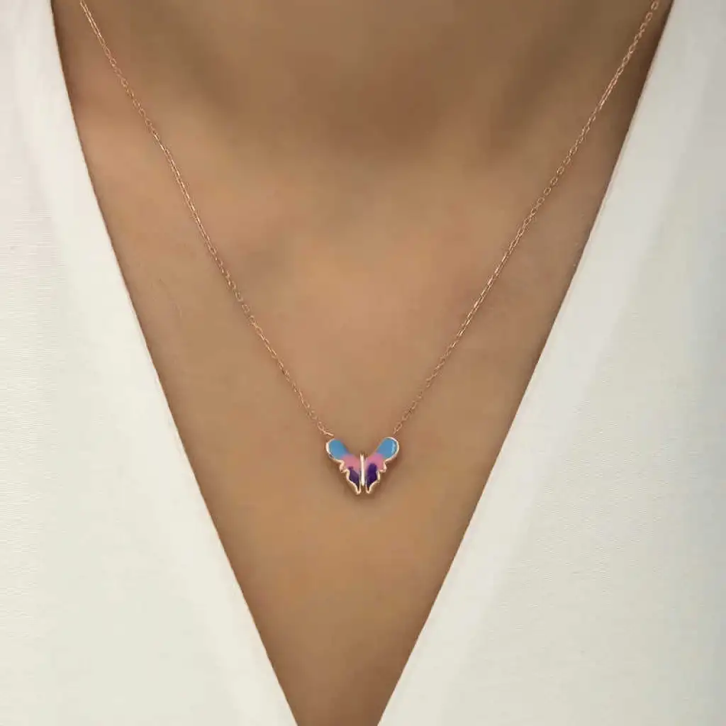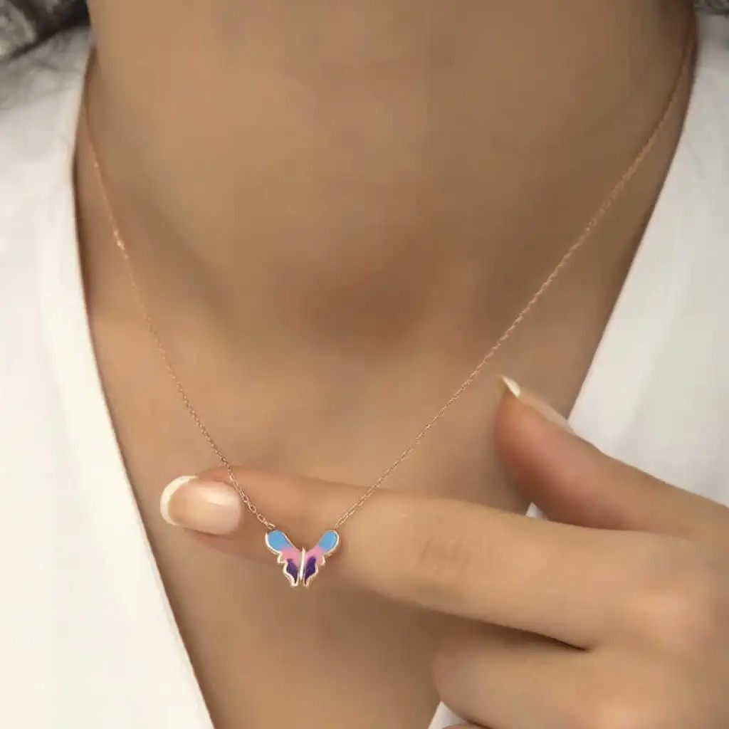 Özgürlüğü masumiyeti ve saflığı simgeleyen kelebekler, tertemiz sevginin ve aşkın ifadesidir. Bahar kelebekleri kolye anlam itibari ile aşkın küçük bir kıvılcım ile başladığı daha sonra büyük bir sabır ile büyüdüğü ve en sonunda ilan-ı aşkı ifade eder. Sizin olduğu kadar sevdiklerinizin de keyifle takacağı minimal kelebek bayan kolye en güzel hediyelerden biri olacaktır. Kolye 925 ayar gümüşten imal edilmiştir. Gümüş üzerine rose kaplama yapılmıştır. Rose kaplama yapılan gümüş bayan kolyeler parlaklığını uzun süre muhafaza eder, ve oksitlenmeyi geciktirir. Kolye üzerinde bulunan renkler mine işlemesidir. Gümüş olan zincir boyu ortalama 45 cm'dir. Tüm gümüş bayan kolyelerde olduğu gibi gümüş minimal kelebek bayan kolye de el emeği ile üretilmiştir. Gümüş ve değerli taşlar nedeniyle belirtilen ürün ağırlığında ± %10 sapma olabilmektedir.