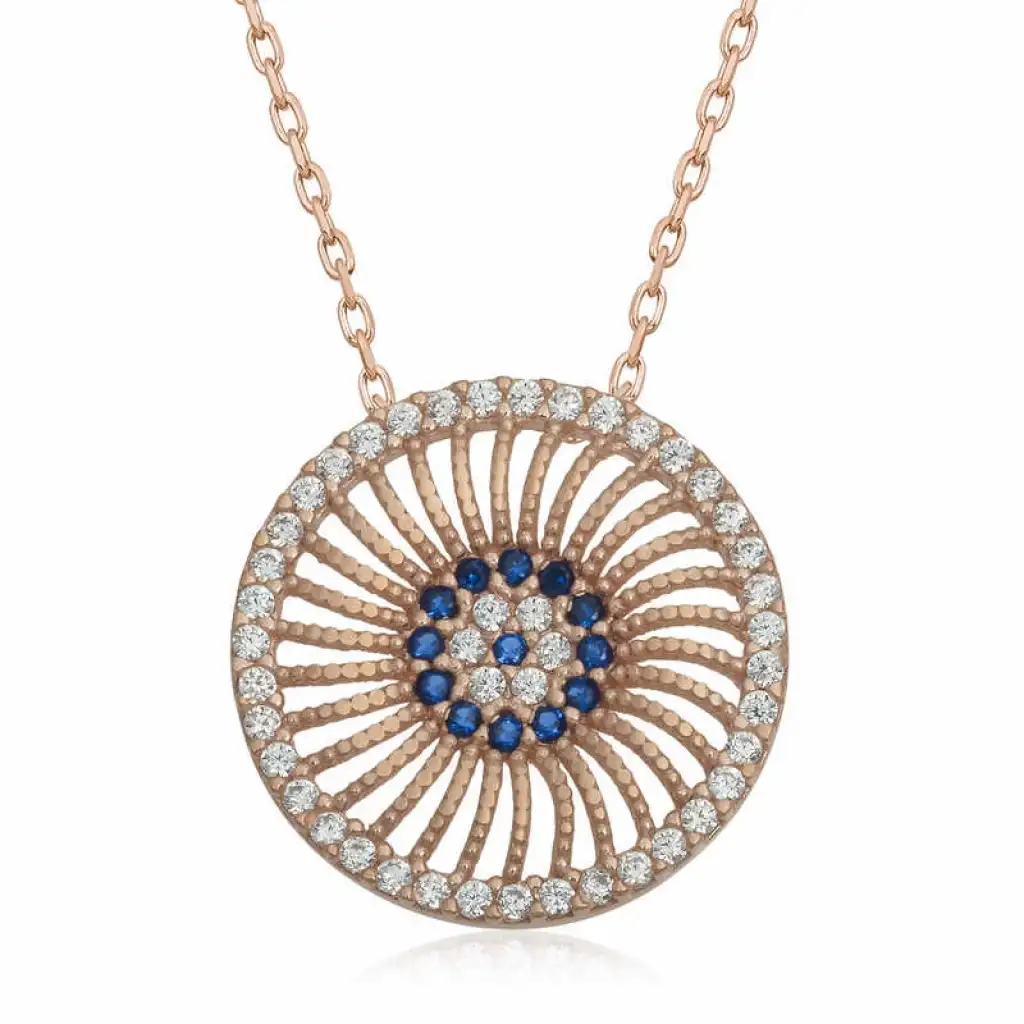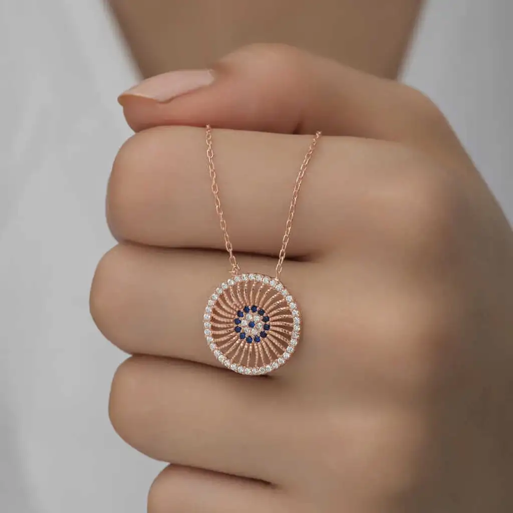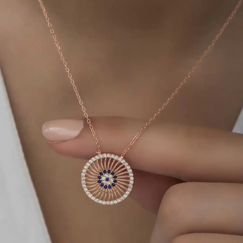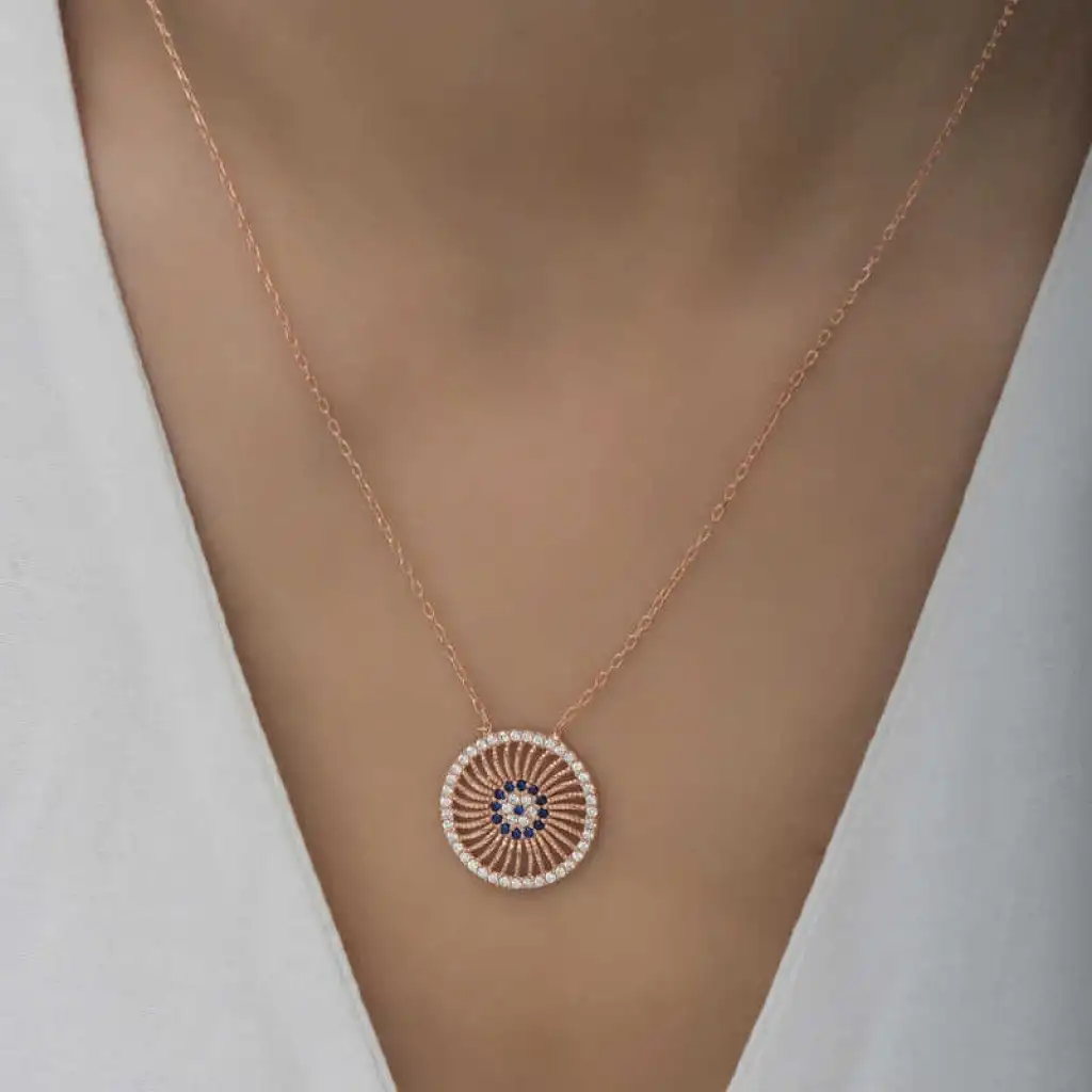 Birçok kültürde kötü enerjinin zararlarından korunmak için çeşitli tılsımlar kullanılmıştır. Doğu kültürlerinin çoğunda kullanılan tılsım ise gözdür. Nazar boncuğu da göz şeklinden ilhamla tasarlanmıştır. Mavi rengin seçilmesi de tesadüf değildir. Renkli gözlü kişilerin enerjisini daha etkili yansıttığı inancı gereği nazar boncukları çoğunlukla mavi olarak tasarlanır. Güzelliğiyle göz kamaştıran, nazardan korunmasını istediğiniz kişilere ve sevdiklerinize nazar kolyeyi armağan edebilirsiniz. Nazar kadın kolye modeli 925 ayar gümüşten imal edilmiştir. Gümüş üzerine rose kaplama yapılmıştır. Rose kaplama yapılan gümüş nazar kolye modelleri parlaklığını uzun süre muhafaza eder ve oksitlenmesi gecikir. Kolye üzerinde bulunan taşlar zirkon'dur. Bu nazar kadın kolye modeli diğer tüm gümüş kadın kolye modellerinde olduğu gibi el emeği ile üretilmiştir. Gümüş ve değerli taşlar nedeniyle belirtilen ortalama ürün ağırlığında ± %10 sapma olabilmektedir.