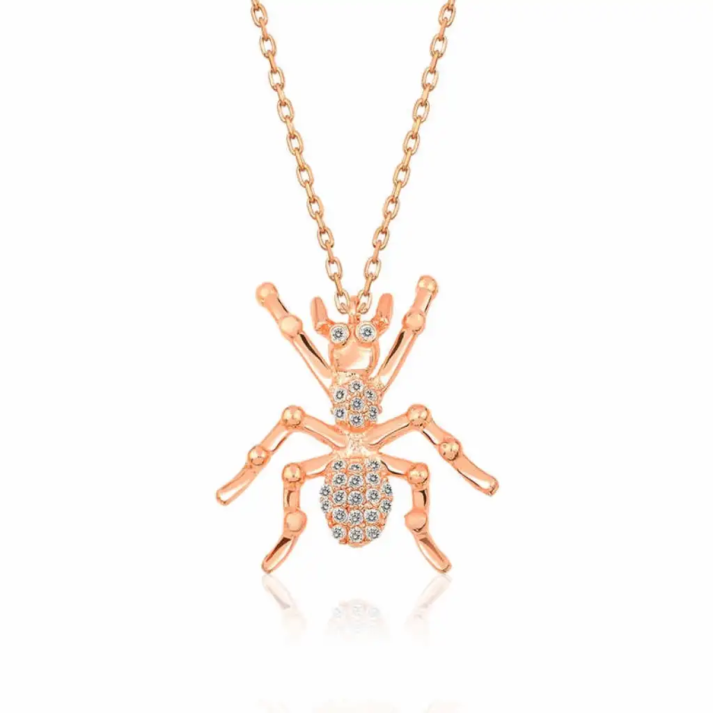 Örümcek; mitolojide, sembolizmde ve efsanelerde yer alan popüler kültürün çeşitli filmlerinde yer almışlardır. Müslümanlar için örümceğin önemi, Peygamberi (S.A.V) ve ilk Müslümanlardan Ebubekir’i (R.A.)Sevr Dağı’ndaki mağarada saklanırken koruyan ve düşmanının gözünden saklayan büyük ağı örmesinde yatar. Mağara önünde birden yetişen ağaca çabucak yuva kuran güvercinler de, bu öneme layık varlıklardandır. Gümüş örümcek bayan kolye modeli 925 ayar gümüşten imal edilmiştir. Gümüş üzerine rose kaplama yapılmıştır. Rose kaplama yapılan gümüş bayan kolyeler parlaklığını uzun süre muhafaza eder ve oksitlenmesi gecikir. Gümüş olan zincirin boyu ortalama 45 cm'dir. Tüm gümüş bayan kolye modellerinde olduğu gibi gümüş örümcek bayan kolye modeli de el emeği ile üretilmiştir. Gümüş ve değerli taşlar nedeniyle belirtilen ortalama ürün ağırlığında ± %10 sapma olabilmektedir. Not : Üzerine yazılacak harfi not kısmında belirtiniz.