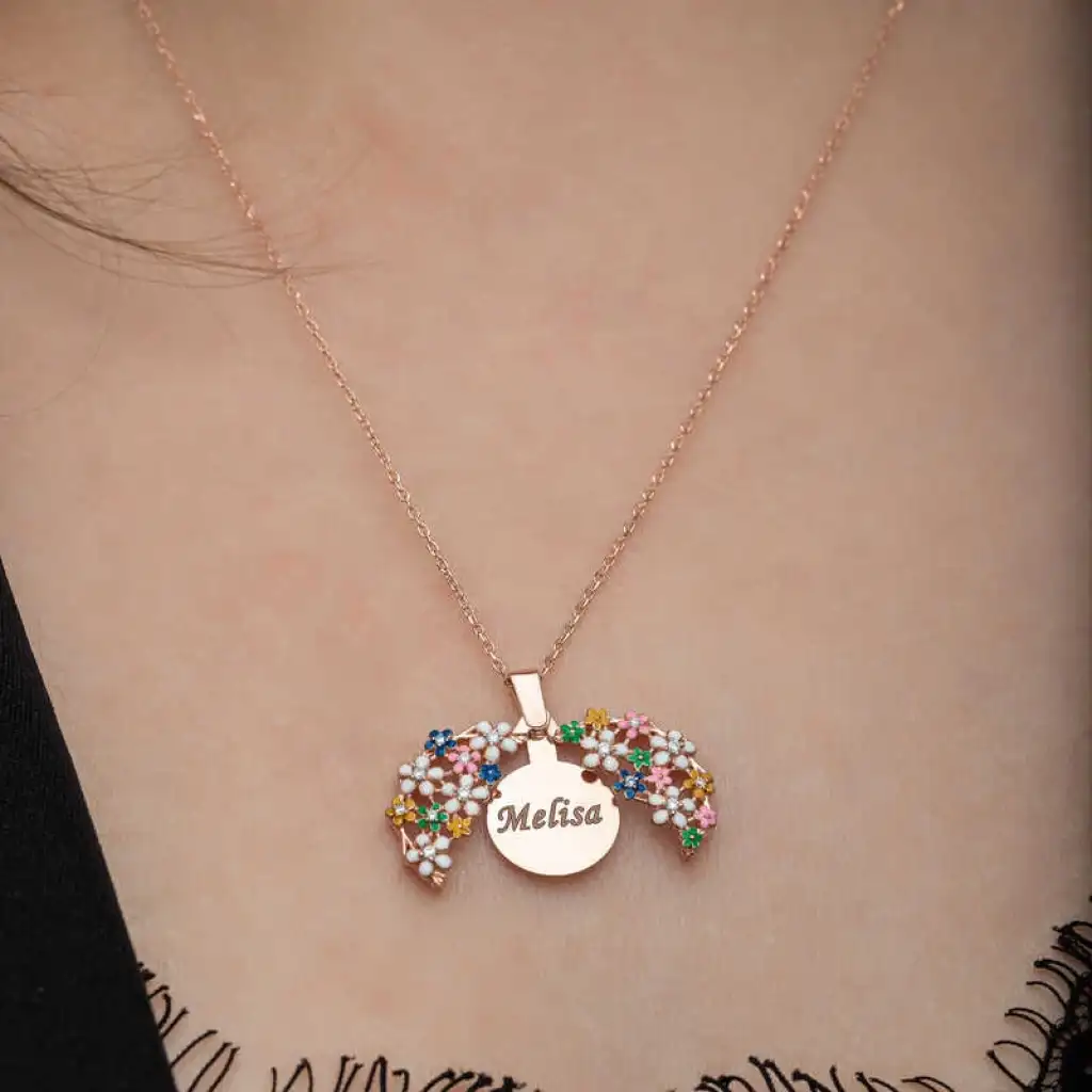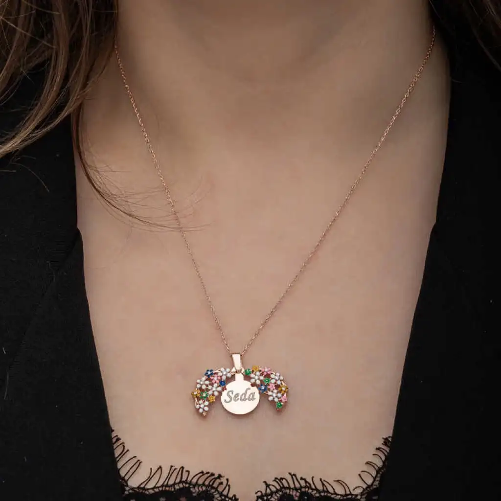Gümüş Rose Renkli Çiçek Kişiye Özel Kadın Kolye