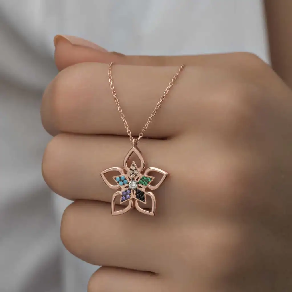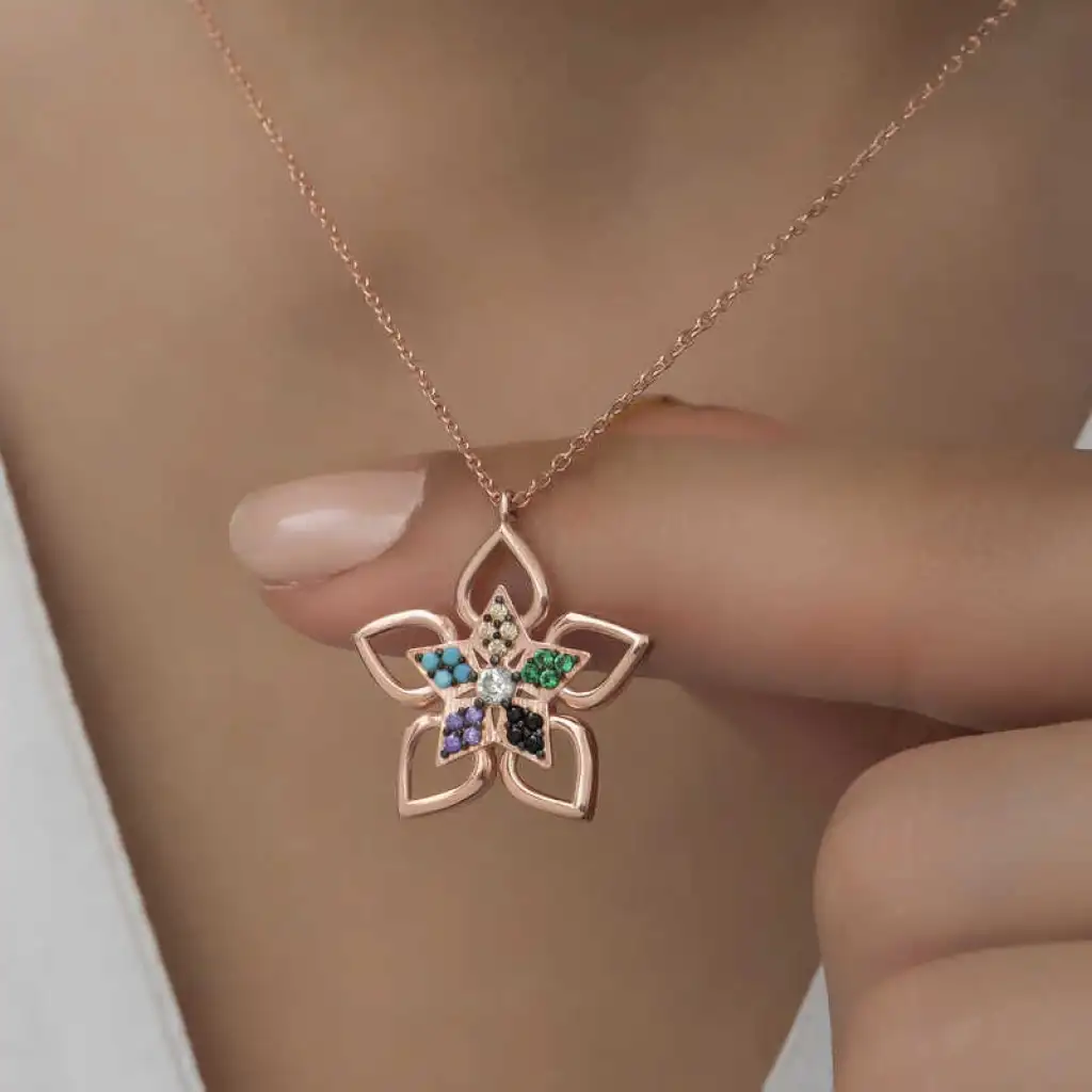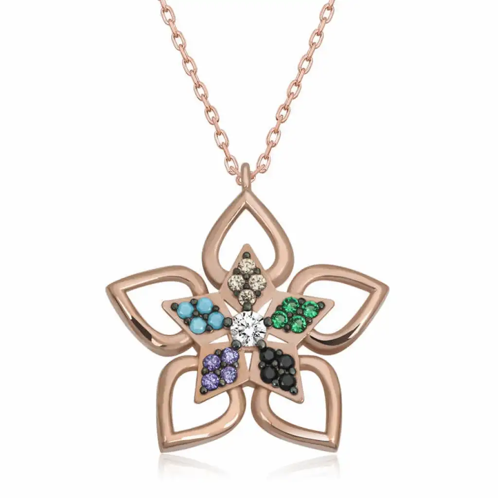 Gümüş Rose Renkli Taşlı Çiçek Kadın Kolye