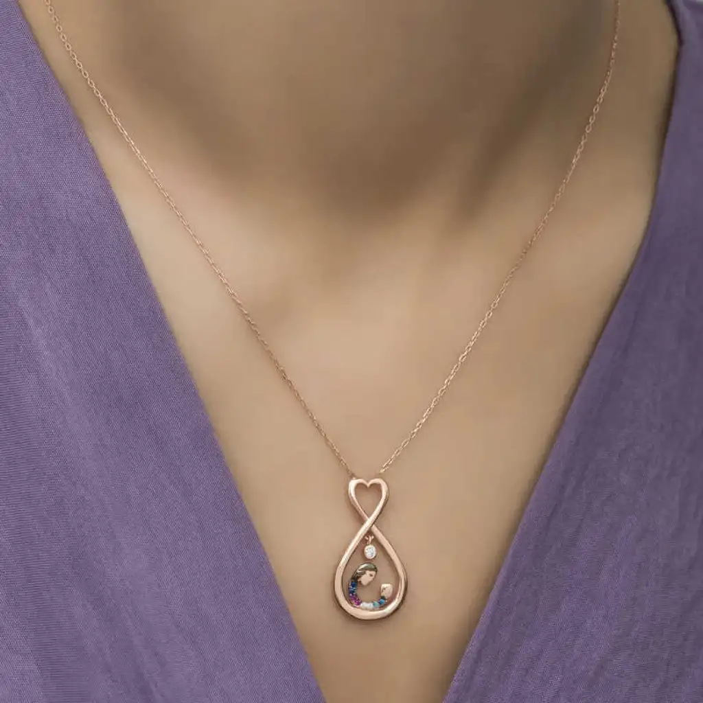 Çocuk ve anne arasındaki sevgiyi temsil eden özel bir tasarımdır. Annenize olan bağlılığınızı belirtmek için alabileceğiniz en uygun hediyelerden biri bu anne çocuk sevgisi kolye olacaktır. Anneniz için tasarlanan bu özel tasarım kalpli anne çocuk kolyesi 925 ayar gümüşten imal edilmiştir. Gümüş üzerine rose kaplama yapılmıştır. Rose kaplama yapılan gümüş anne çocuk kolye modelleri parlaklığını uzun süre muhafaza eder ve oksitlenmesi gecikir. Kolye üzerinde bulunan taşlar zirkondur. Gümüş olan zincir boyu ortalama 45 cm'dir. Gümüş sonsuz kalpli anne çocuk kolyesi el emeği ile üretilmiştir. Gümüş ve değerli taşlar nedeniyle belirtilen ortalama ürün ağırlığında ± %10 sapma olabilmektedir.