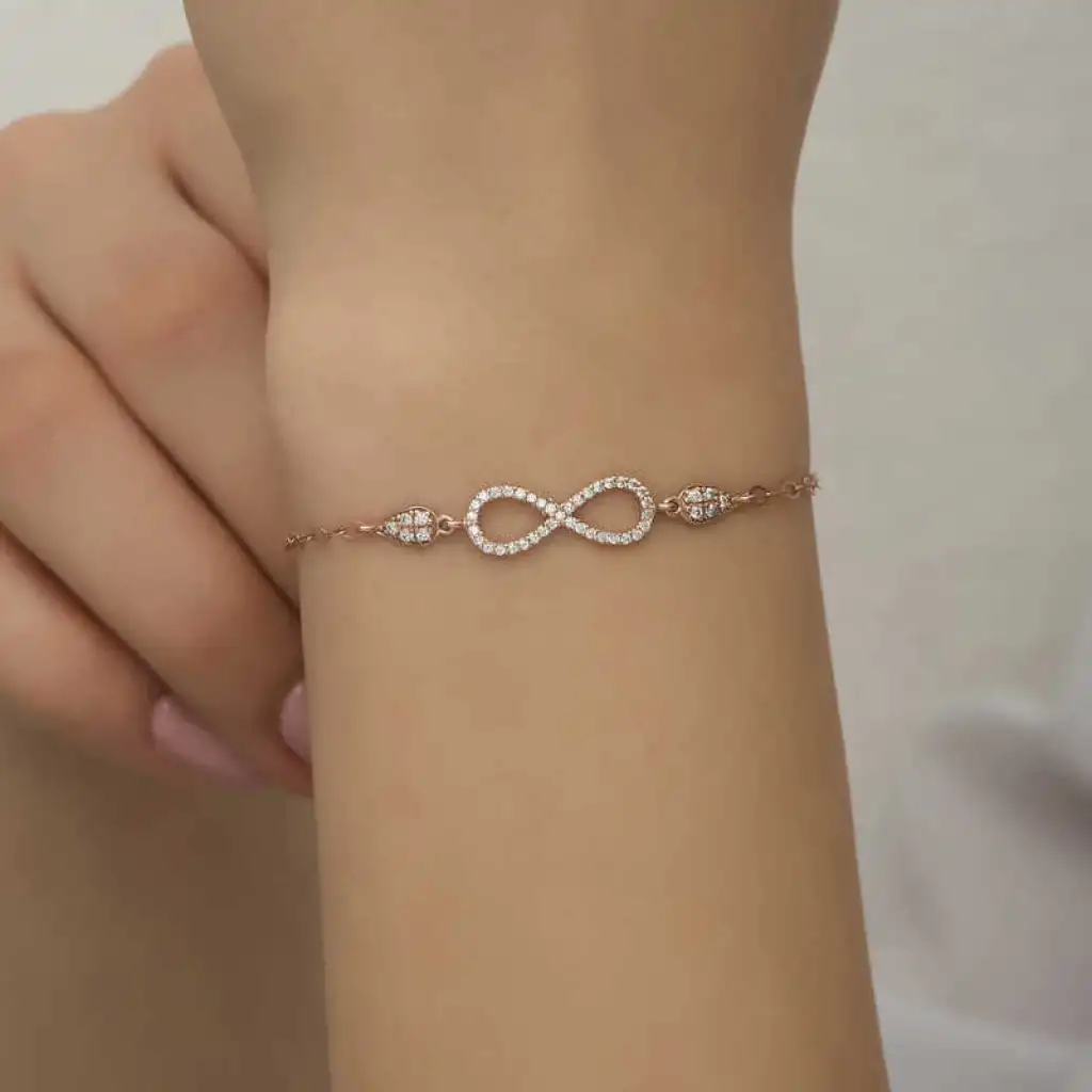 Gümüş zirkon taşlar ve sonsuzluk modelinin bir araya geldiği sevdiklerinize sevginizi gösterebileceğiniz şık ve anlamlı bir hediye olacaktır. Bu sonsuzluk model bileklik üzerine rose kaplama yapılmıştır. Rose kaplama yapılan gümüş kadın bileklik modelleri parlaklığını uzun süre muhafaza eder ve oksitlenmesi gecikir. Kadın bileklik modellerinin tamamında olduğu gibi gümüş sonsuzluk kadın bileklik modeli de el emeği ile üretilmiştir. Gümüş ve değerli taşlar nedeniyle belirtilen ortalama ürün ağırlığında ± %10 sapma olabilmektedir.