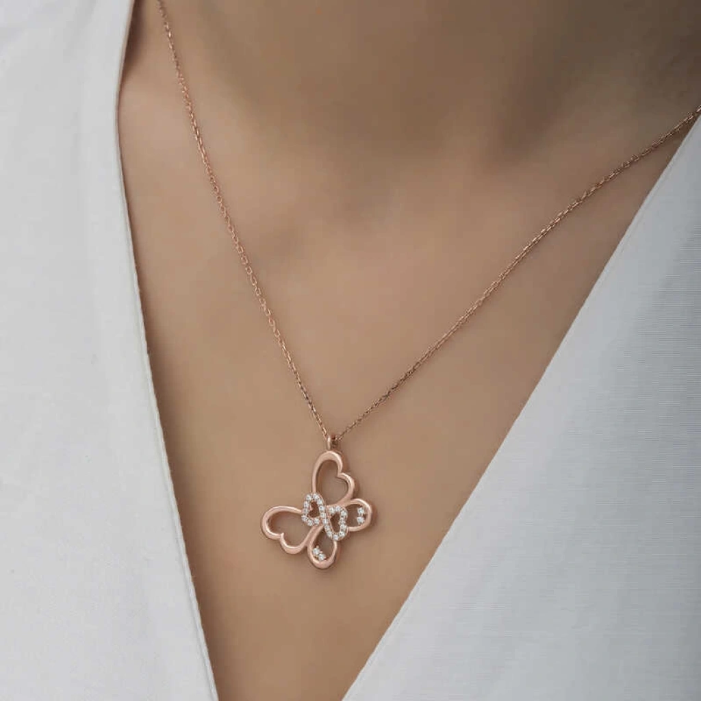 Kelebek kolye tertemiz sevginin ve aşkın ifadesidir. Sonsuz sevginizi sevdiğinize gösterebileceğiniz bir kolye modelidir. Sevdiklerinize alabileceğiniz anlamlı bir hediye bu şık kelebek kadın kolye 925 ayar gümüşten imal edilmiştir. Gümüş üzerine rose kaplama yapılmıştır. Rose kaplama yapılan gümüş kadın kolye modelleri parlaklığını uzun süre muhafaza eder ve oksitlenmesi gecikir. Kolye üzerinde bulunan beyaz taşlar zirkondur. Gümüş olan zincir boyu ortalama 45 cm'dir. Gümüş sonsuzluk kelebek kadın kolye modeli diğer tüm gümüş kadın kolye modellerinde olduğu gibi el emeği ile üretilmiştir. Gümüş ve değerli taşlar nedeniyle belirtilen ortalama ürün ağırlığında ± %10 sapma olabilmektedir.