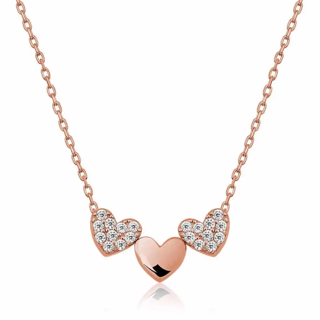 Kalp simgesi daima koşulsuz sevginin ve aşkın sembolü olmuştur. Dini öğretilerde ise kalbin gücü sınırsızdır. Çünkü kalp Yaradanın evi, bizim ise evrene açılan gerçeklik kapımızdır. Üç kalp kolye sevginizi temsil edecek en şık ve anlamlı kolyelerden biridir. Bu şık üç kalpli kolye; doğum günü hediyesi, sevgililer günü hediyesi veya annelere hediye olarak özel günlerde tercih edilebilecek mükemmel bir seçenektir. Gümüş zirkon taşlı üç kalp bayan kolye 925 ayar gümüşten imal edilmiştir. Bu kolye üzerinde rose kaplama yapılmıştır. Rose kaplama yapılan gümüş bayan kolye modelleri parlaklığını uzun süre muhafaza eder. Üzerinde bulunan ışıl ışıl taşlar zirkondur. Tüm gümüş bayan kolye modellerinde olduğu gibi gümüş üç kalp bayan kolye modeli de el emeği ile üretilmiştir. Gümüş ve değerli taşlar nedeniyle belirtilen ortalama ürün ağırlığında ± %10 sapma olabilmektedir.