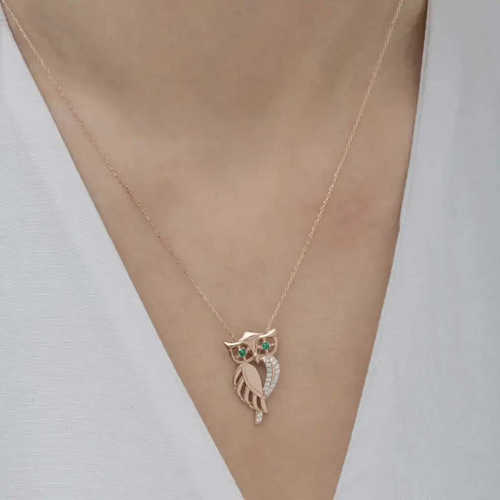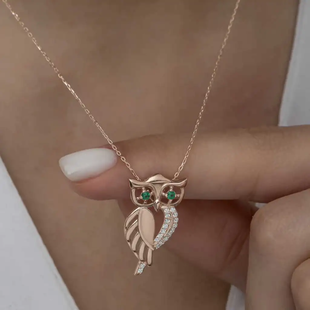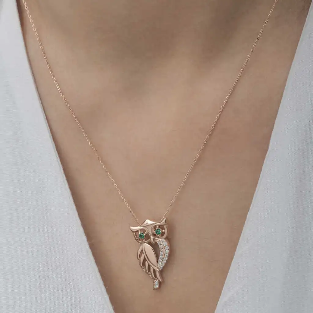 Baykuş, tarihte ve farklı kültürlerde zengin anlamlara sahip mitolojik bir hayvandır. Baykuş aksesuarlarının bu kadar sevilme nedeni güçlü sembolik anlamları olmasından kaynaklanıyor. Gece görme yeteneği sayesinde sezgisel güçlerinin kuvvetli olmasından dolayı simgesel olarak bilgeliği temsil etmektedir. Siz de bu kolyeyi günlük hayatta severek kullanabilir sevdiklerinize özel günlerde hediye edebilirsiniz. Bu şık tasarım kolye 925 ayar gümüşten imal edilmiştir. Gümüş üzerine rose kaplama yapılmıştır. Tüm gümüş ürünlerde olduğu gibi gümüş yeşil gözlü baykuş kadın kolye de tamamı el emeği ile üretilmiştir. Gümüş ve değerli taşlar nedeniyle belirtilen ortalama ürün ağırlığında ± %10 sapma olabilmektedir.