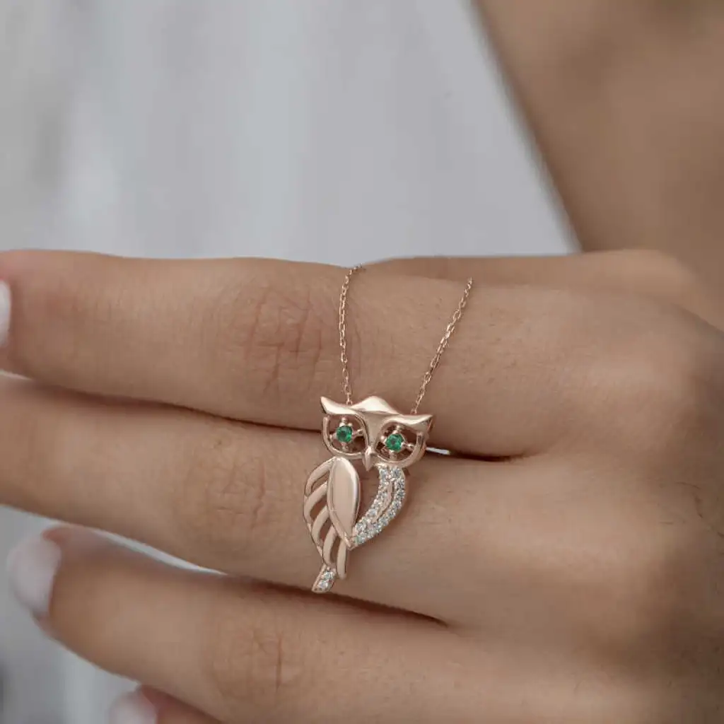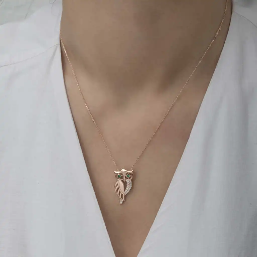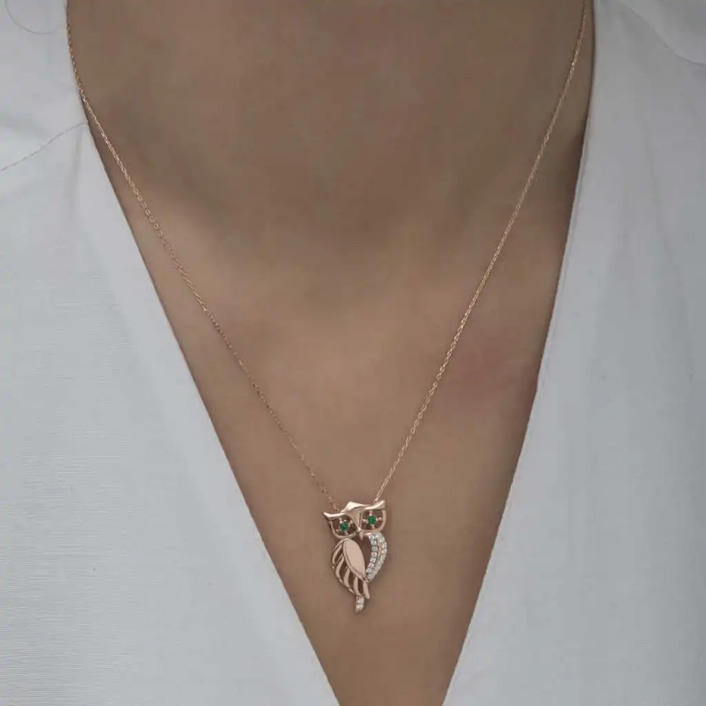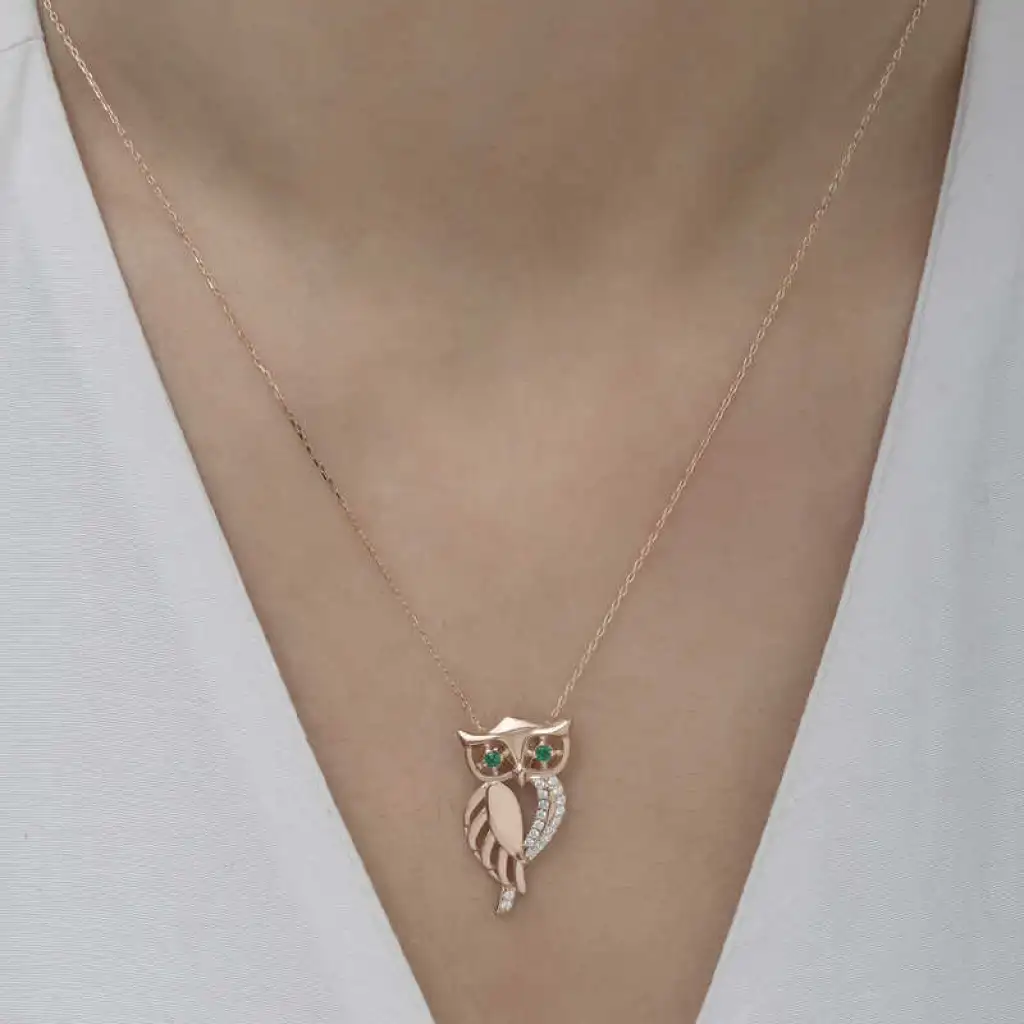 Baykuş, tarihte ve farklı kültürlerde zengin anlamlara sahip mitolojik bir hayvandır. Baykuş aksesuarlarının bu kadar sevilme nedeni güçlü sembolik anlamları olmasından kaynaklanıyor. Gece görme yeteneği sayesinde sezgisel güçlerinin kuvvetli olmasından dolayı simgesel olarak bilgeliği temsil etmektedir. Siz de bu kolyeyi günlük hayatta severek kullanabilir sevdiklerinize özel günlerde hediye edebilirsiniz. Bu şık tasarım kolye 925 ayar gümüşten imal edilmiştir. Gümüş üzerine rose kaplama yapılmıştır. Tüm gümüş ürünlerde olduğu gibi gümüş yeşil gözlü baykuş kadın kolye de tamamı el emeği ile üretilmiştir. Gümüş ve değerli taşlar nedeniyle belirtilen ortalama ürün ağırlığında ± %10 sapma olabilmektedir.