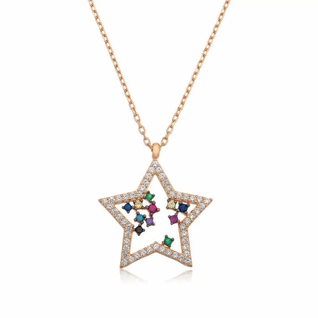 Yıldız, pek çok inanılan uğurlu bir semboldür. Venüs Gezegeninin enerjisini taşır. Venüs Gezegeni, aşk ve enerjinin de temsilcisidir. Bu şık kolye; doğum günü hediyesi, sevgili günü günü hediyesi annelere hediye olarak özel günlerde veya çok güzel bir hediye. Gümüş bayan kolye 925 ayar gümüşten imal edilmiştir. Bu kolye üzerinde gül altın kaplama vardır. Rose altın kaplama kaplama gümüş bayan kolye modelleri uzun süre muhafaza eder, gümüş rengi pembe renge çevirir. Üzerinde bulunan ışıl ışıl taşlar zirkondur. Tüm gümüş bayan kolye modellerimizde olduğu gibi gümüş yıldız bayan kolye modeli de el emeği ile yapılmıştır. Gümüş ve değerli taşlar nedeniyle genellikle çok yüksek olan nesneler ± %10 sapma olabiliyor.