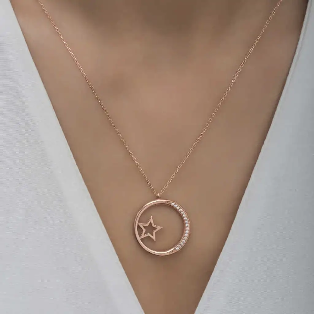 Gümüş Rose Yıldız Detaylı Halka Kadın Kolye