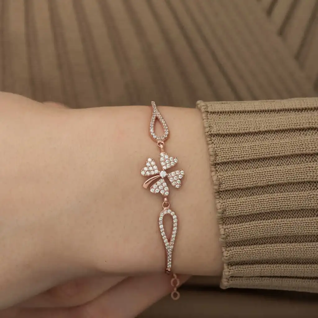 Dört yapraklı yonca bütün kültürlerde iyi şansın sembolü olarak kabul edilir. Yoncanın dört yaprağının da ayrı birer anlamı vardır. Birinci yaprak ümidi, ikincisi imanı, üçüncüsü aşkı, dördüncü yaprak ise şansı simgeler. Dört kalbin birleşmesiyle oluşan özel tasarım bayan bileklik modeli 925 ayar gümüşten imal edilmiştir. Bu zarif bileklik genç aşıkların özel günlerde tercih edebileceği çok şık bir seçenek olacaktır. Gümüş kalpli yonca bayan bileklik üzerinde rose kaplama vardır. Rose kaplama yapılan gümüş bayan bileklikler parlaklığını uzun süre muhafaza eder, gümüşe pembe rengini verir ve oksitlenmeyi geciktirir. Gümüş yonca bayan bileklik sizin olduğu kadar sevdiklerinizin de keyifle takacağı en güzel hediyelerden biri olacaktır. Tüm gümüş bayan bileklik modellerimizde olduğu gibi gümüş rose yonca bileklik de el emeği ile üretilmiştir. Gümüş ve değerli taşlar nedeniyle belirtilen ürün ağırlığında ± %10 sapma olabilmektedir.