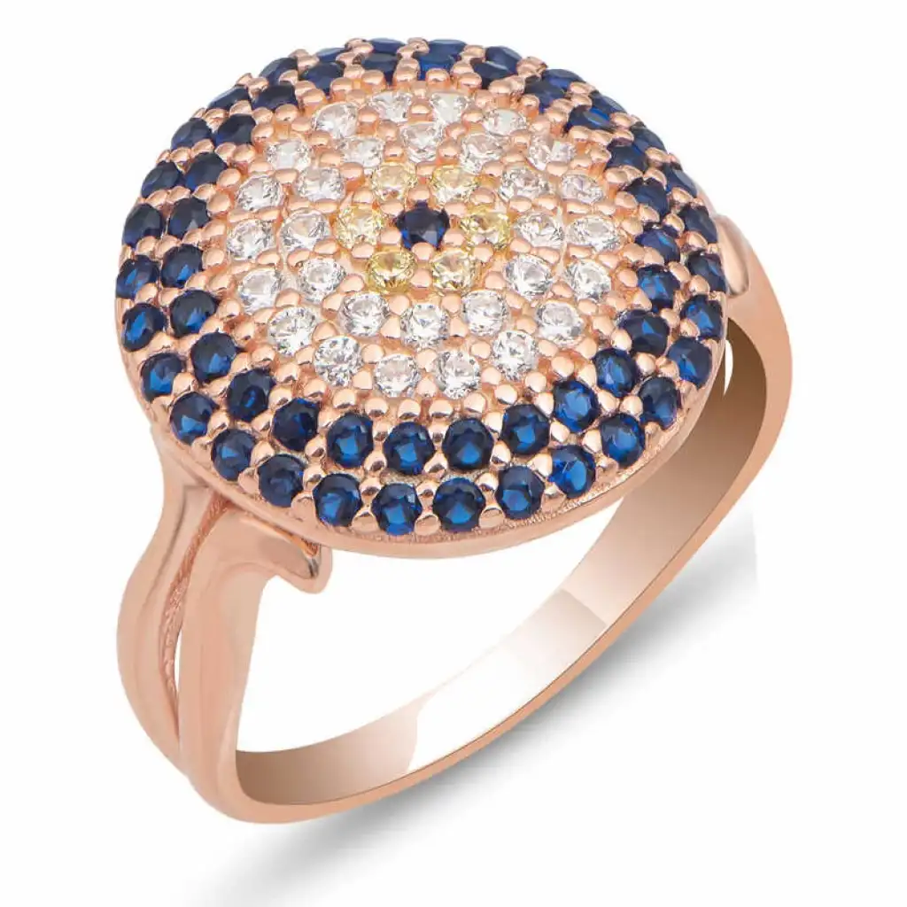 Her yaşa ve yaşam biçimine uygun şık tasarımlar günün her anında size eşlik edecek bir model. Nazar boncuğu güzelliğinize güzellik katacak. Aynı zamanda sizi kem gözlerden uzak tutacaktır. Bu nazarlı kadın yüzük 925 ayar gümüşten imal edilmiştir. Gümüş üzerine rose kaplama yapılmıştır. Rose kaplama yapılan gümüş kadın yüzük modelleri parlaklığını uzun süre muhafaza eder ve oksitlenmesi gecikir. Yüzük üzerinde bulunan taşlar zirkondur. Gümüş yuvarlak nazarlı kadın yüzük diğer kadın yüzük modellerinde olduğu gibi el emeği ile üretilmiştir. Gümüş ve değerli taşlar nedeniyle belirtilen ortalama ürün ağırlığında ± %10 sapma olabilmektedir.