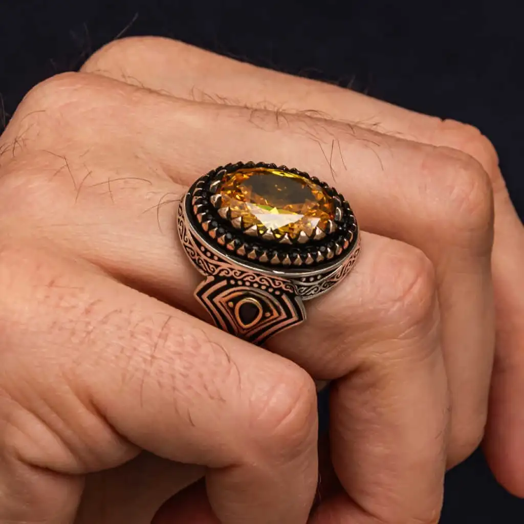 Gümüş Sarı Sitrin Taşlı Desenli Erkek Yüzük