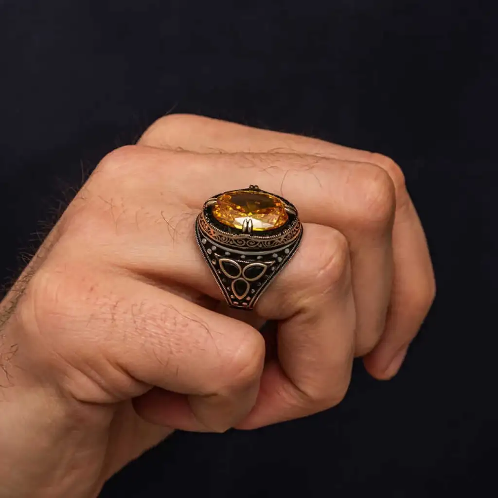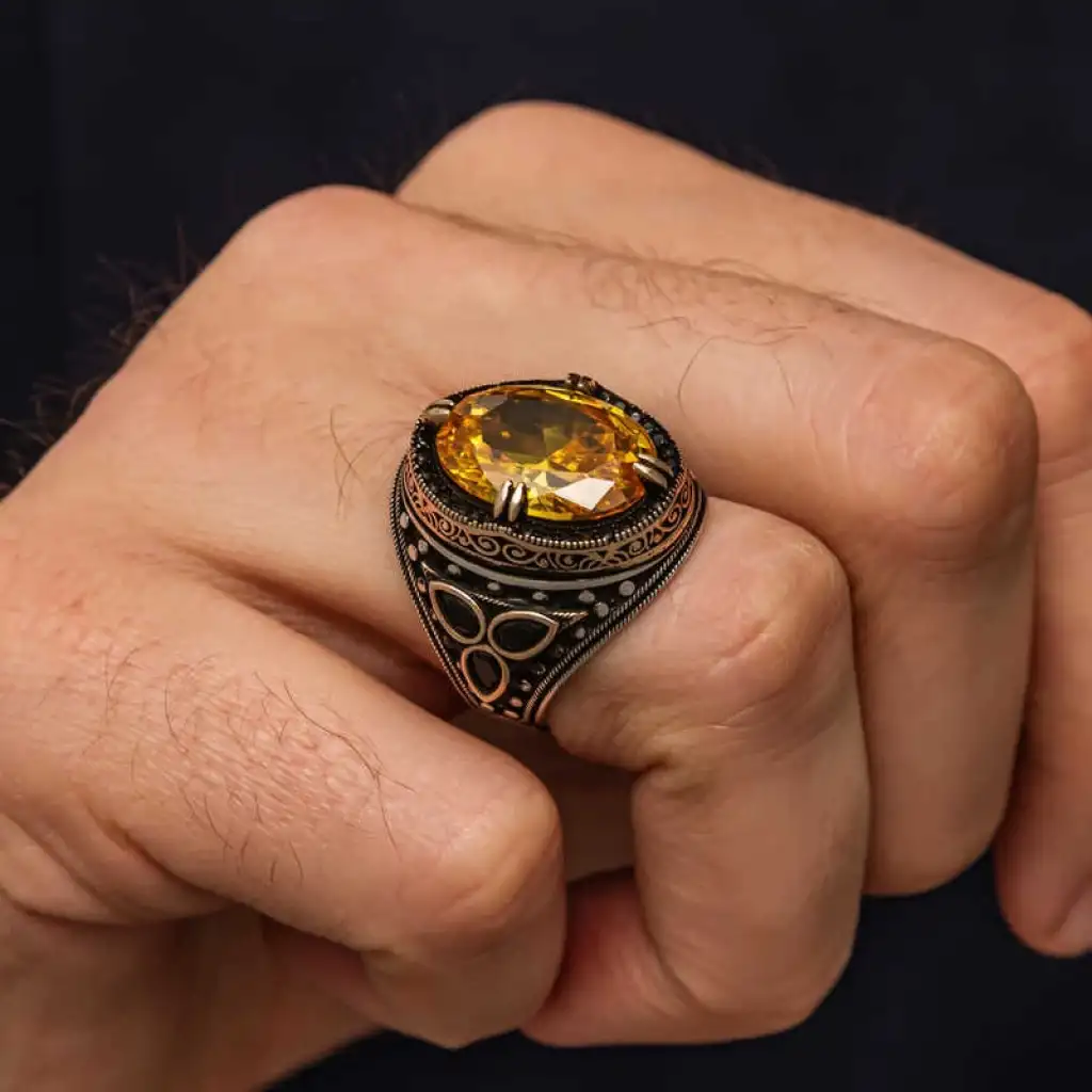 Gümüş Sarı Sitrin Taşlı Erkek Yüzük