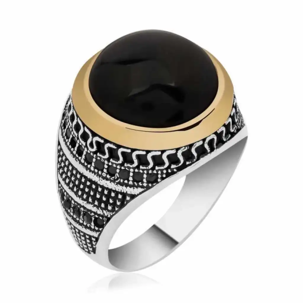 Gümüş Sıkma Kehribar Taşlı Erkek Yüzük