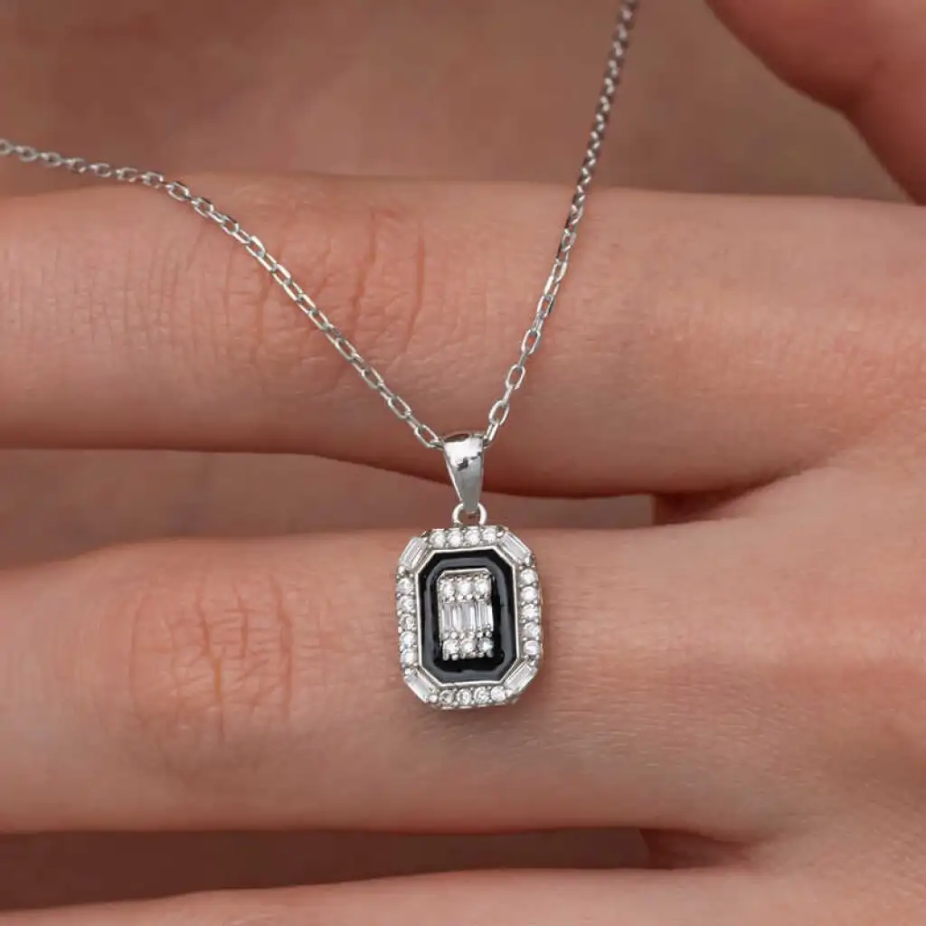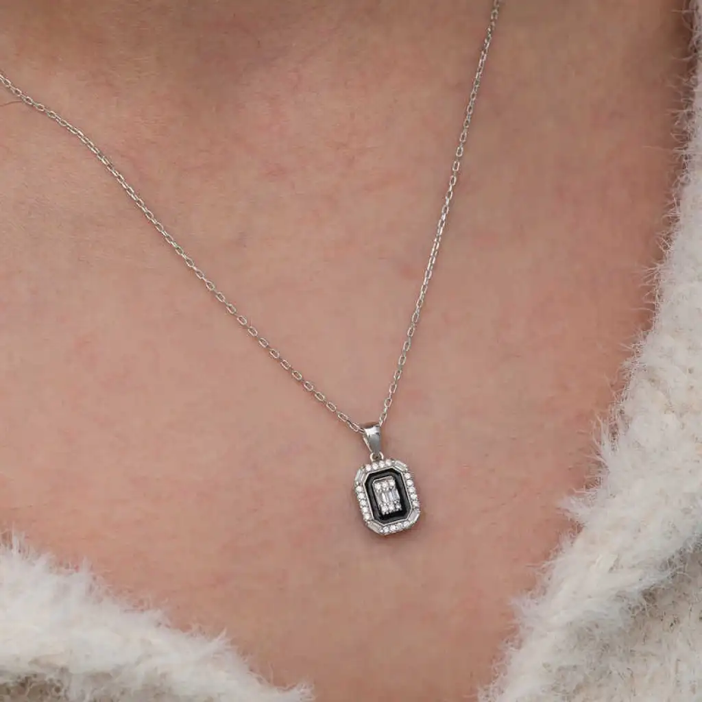 Modası hiçbir zaman geçmeyecek olan baget taşlı kadın kolye, günümüz takıları ile farklı stillerde yeniden yorumlanıyor.Klasik siyah-beyaz kontrastı, her tarzla uyum sağlar.Bu şık kolye; doğum günü hediyesi, sevgililer günü veya özel günlerde tercih edilebilecek mükemmel bir seçenektir.Kolye; 925 ayar gümüşten imal edilmiştir. Gümüş üzerine rodyum kaplama yapılmıştır. Gümüş ve değerli taşlar nedeniyle belirtilen ortalama ürün ağırlığında ± %10 sapma olabilmektedir.
