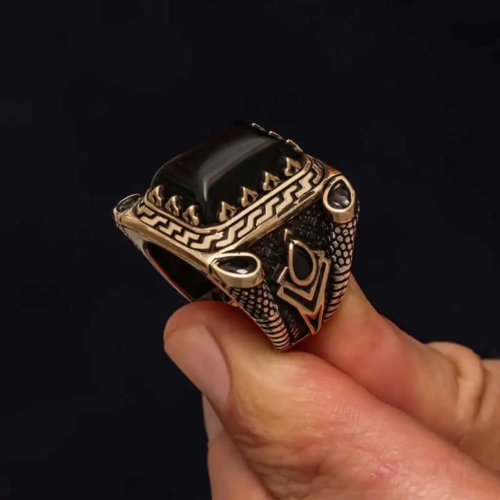 Siyah oniks taşlı erkek yüzük, genellikle gücü, cesareti ve kararlılığı simgeler. Oniks taşı, eski çağlardan beri koruyucu özellikleri ile bilinir ve negatif enerjilerden arındırma amacıyla kullanılır. Siyah rengi, otorite ve ciddiyet ile ilişkilendirilir. Siyah Oniks'in güç, koruma ve topraklama sağladığına inanılır.Kendinize yada sevdiklerinize doğum gününde, babalar gününde yada özel günlerde hediye edebilirsiniz. Gümüş üzerine oksit kaplama yapılmıştır.Kendinize yada sevdiklerinize doğum gününde, babalar gününde yada özel günlerde hediye edebilirsiniz. Gümüş üzerine oksit kaplama yapılmıştır.Oksit kaplama yapılan gümüş erkek yüzük modelleri parlaklığını uzun süre muhafaza eder, oksitlenmesi gecikir. Gümüş ve değerli taşlar nedeniyle belirtilen ortalama ürün ağırlığında ± %10 sapma olabilmektedir.
