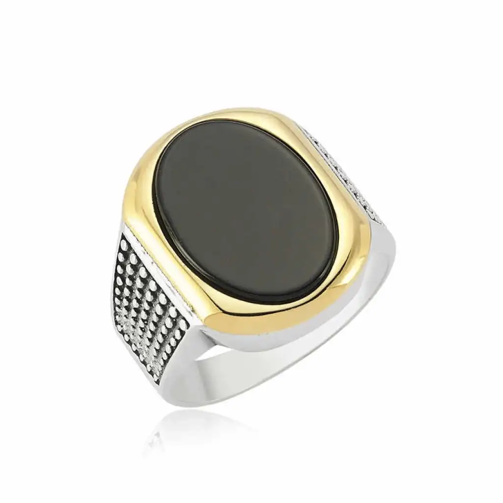 Klasik ve şıklıktan ödün vermeyenler için tasarlanan bu şık yüzük; 925 ayar gümüşten imal edilmiştir. Gümüş üzerine oksit kaplama yapılmıştır. Yüzük üzerinde bulunan siyah taş onikstir. Tüm gümüş erkek yüzüklerinde olduğu gibi gümüş siyah taşlı erkek yüzük de tamamı el emeği ile üretilmiştir. Doğum günü hediyesi, babalar günü veya özel günlerde tercih edilebilecek mükemmel bir seçenektir. Gümüş ve değerli taşlar nedeniyle belirtilen ortalama ürün ağırlığında ± %10 sapma olabilmektedir.
