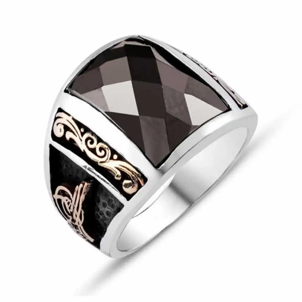 Gümüş Siyah Taşlı Tuğralı Erkek Yüzük