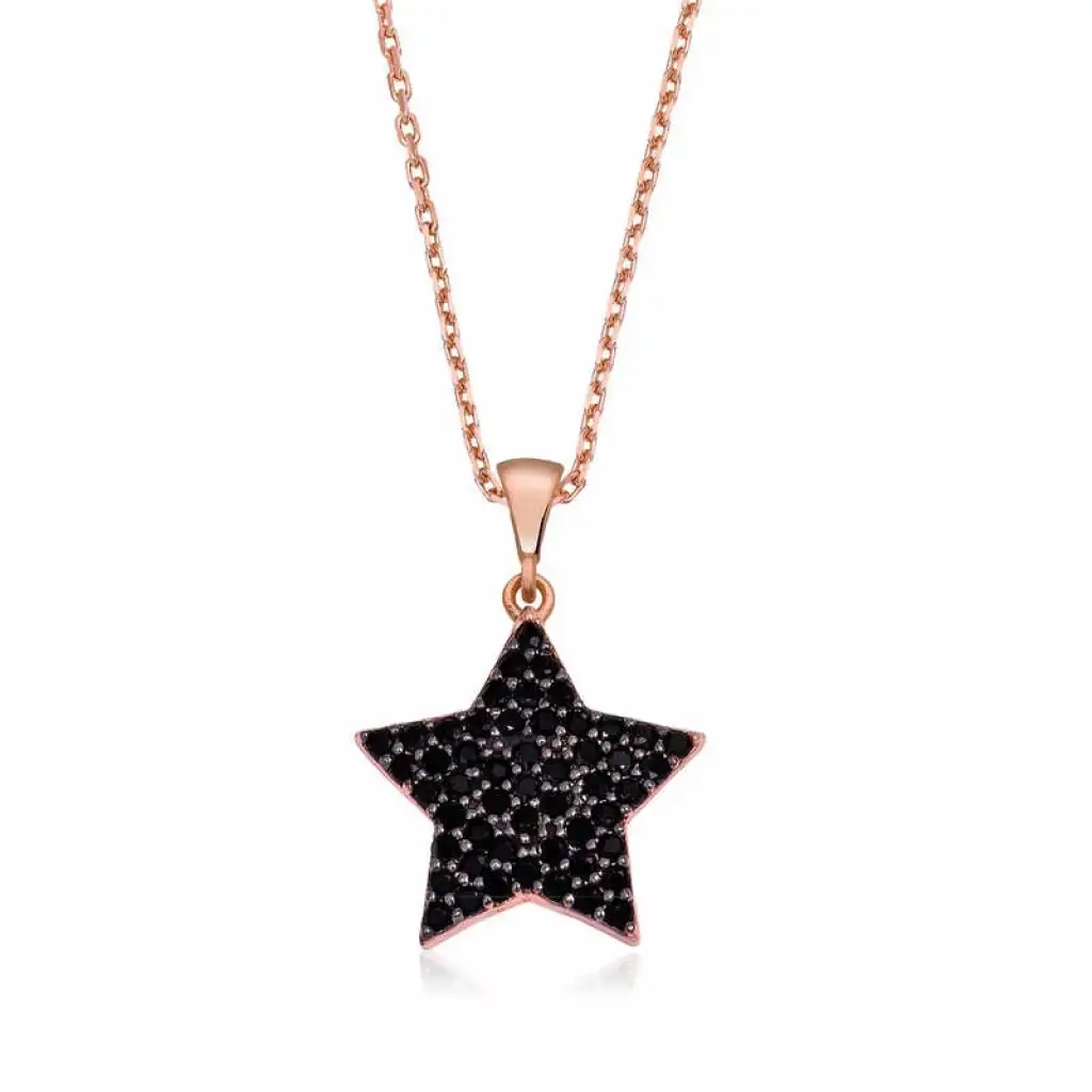 Gecenin parlak ışıltısını anımsatan yıldız, sembolik olarak evrenin sonsuzluğunu, uzaktaki bir noktayı ifade eder. Parıltının, ışığın, aydınlığın ve umudun sembolüdür. Her insan özel, her sevilen eşsizdir. Eşsiz sevginin ömür boyu sürecek birlikteliğin simgesi gümüş yıldız bayan kolye ile sevdiklerinizi mutlu etmeye ne dersiniz... Kolye 925 ayar gümüşten imal edilmiştir. Gümüş üzerine rose kaplama yapılmıştır. Rose kaplama yapılan ürünler parlaklığını uzun süre muhafaza eder, gümüş rengini pembe renge dönüştürür ve oksitlenmeyi geciktirir. Üzerinde bulunan siyah taşlar zirkondur. Gümüş bayan kolye modellerinin tamamında olduğu gibi gümüş siyah yıldız bayan kolye modeli de el emeği ile üretilmiştir. Gümüş ve değerli taşlar nedeniyle belirtilen ortalama ürün ağırlığında ± %10 sapma olabilmektedir.