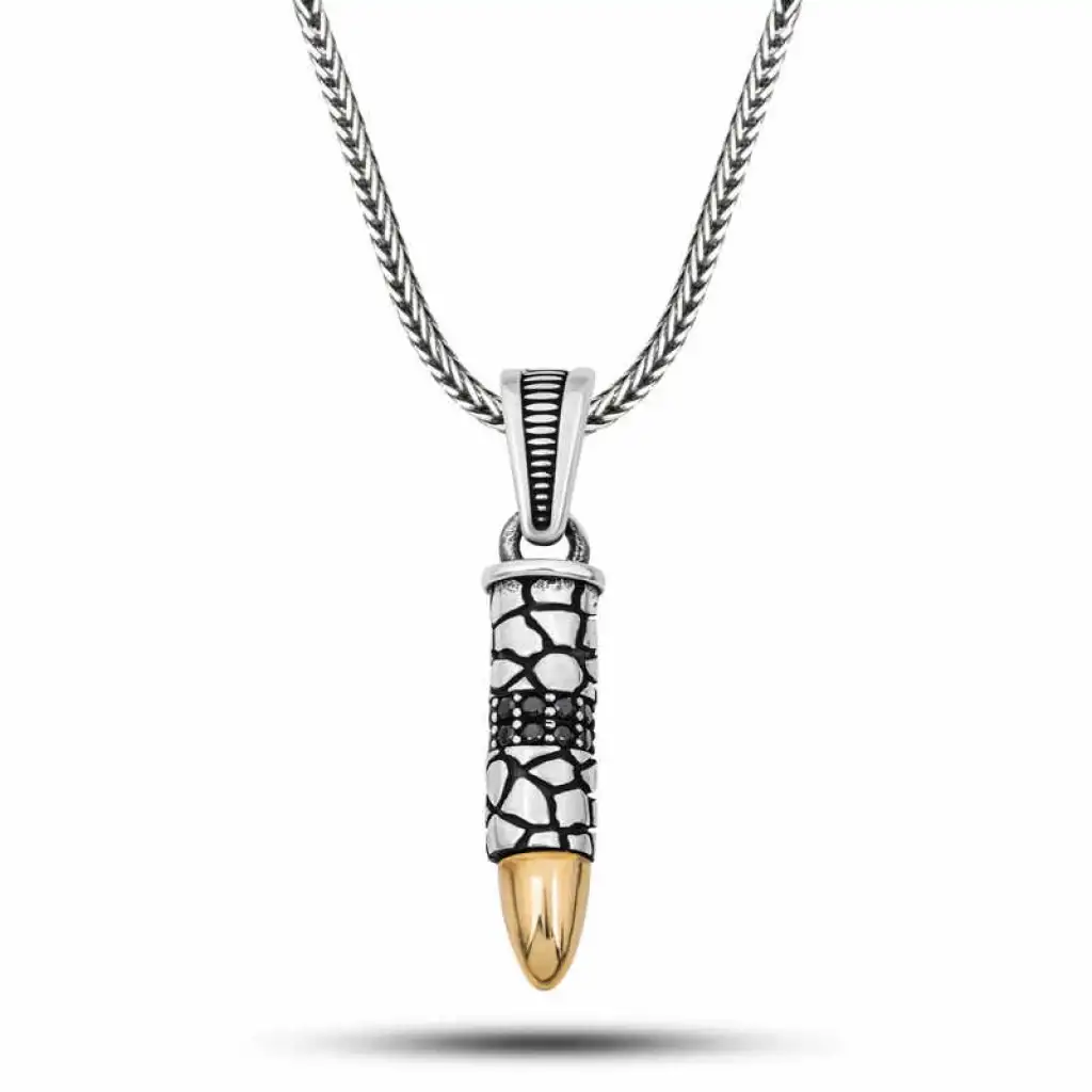 Gümüş Siyah Zirkon Taşlı Mermi Erkek Kolye
