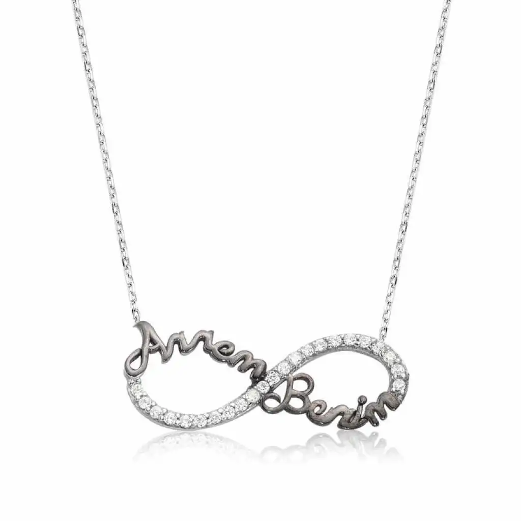 Annenize sonsuz sevginizi ifade etmenin en güzel ve en anlamlı yollarından biri sonsuzluk kolyesidir. Şık tasarımıyla bu özel kolye ile annenize olan sonsuz sevginizi ifade edebilir, sonsuza kadar birlikte olacağınız mesajı verebilirsiniz. Sevilen ve şıklığından ödün vermeyen bu modeli; doğum günü hediyesi, anneler günü hediyesi veya özel günlerde tercih edebilirsiniz. Gümüş sonsuzluk canım annem bayan kolye, 925 ayar gümüşten imal edilmiştir. Gümüş üzerine rodyum kaplama yapılmıştır. Rodyum kaplama yapılan gümüş bayan kolye parlaklığını uzun süre muhafaza eder, oksitlenmesi gecikir. Tüm gümüş bayan kolye modellerinde olduğu gibi bu gümüş sonsuzluk annem benim bayan kolye modeli de tamamı el emeği ile üretilmiştir. Gümüş ve değerli taşlar nedeniyle belirtilen ortalama ürün ağırlığında ± %10 sapma olabilmektedir.