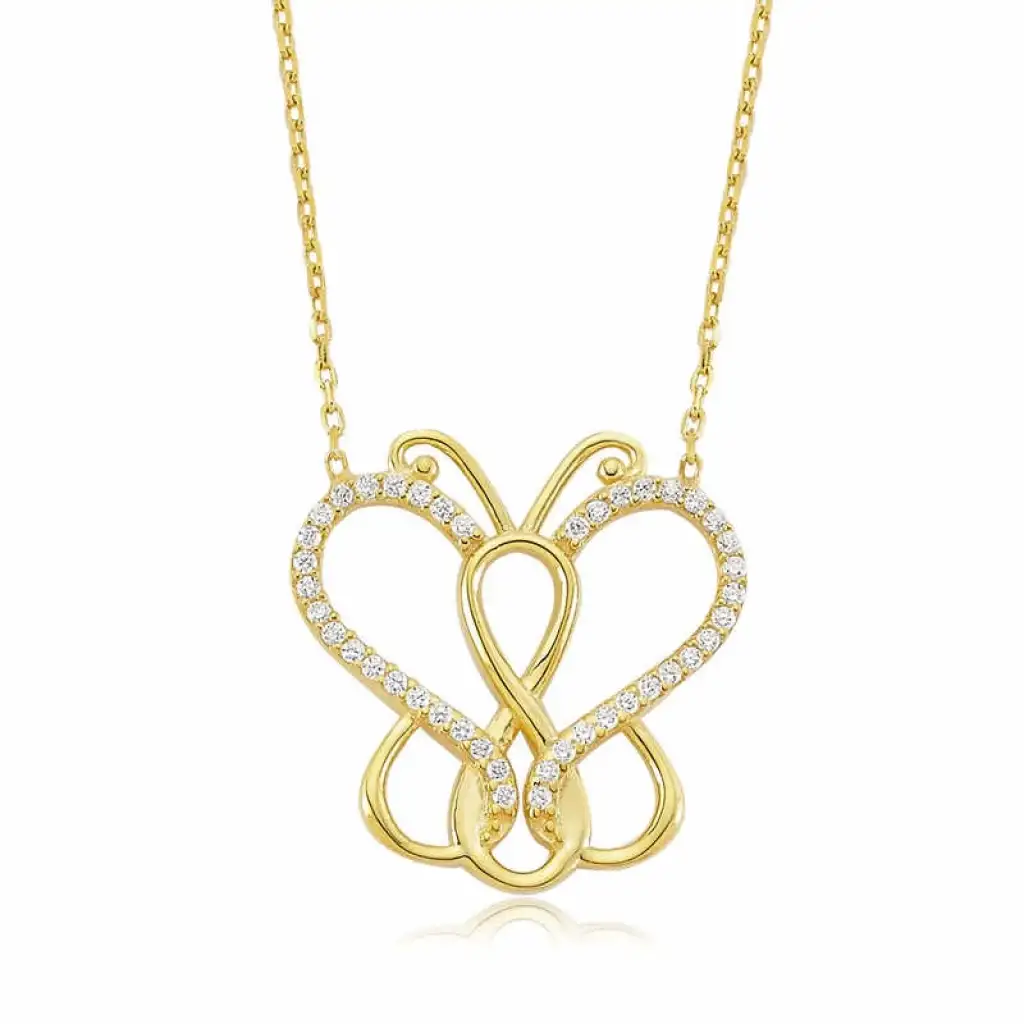 Kelebek kolye tertemiz sevginin ve aşkın ifadesidir. Sonsuz sevginizi sevdiğinize gösterebileceğiniz bir kolye modelidir. Sevdiklerinize alabileceğiniz anlamlı bir hediye bu şık kelebek bayan kolye 925 ayar gümüşten imal edilmiştir. Gümüş üzerine altın kaplama yapılmıştır. Altın kaplama yapılan gümüş bayan kolye modelleri parlaklığını uzun süre muhafaza eder ve oksitlenmesi gecikir. Kolye üzerinde bulunan beyaz taşlar zirkondur. Gümüş olan zincir boyu ortalama 45 cm'dir. Gümüş sonsuzluk kelebek bayan kolye modeli diğer tüm gümüş bayan kolye modellerinde olduğu gibi el emeği ile üretilmiştir. Gümüş ve değerli taşlar nedeniyle belirtilen ortalama ürün ağırlığında ± %10 sapma olabilmektedir.