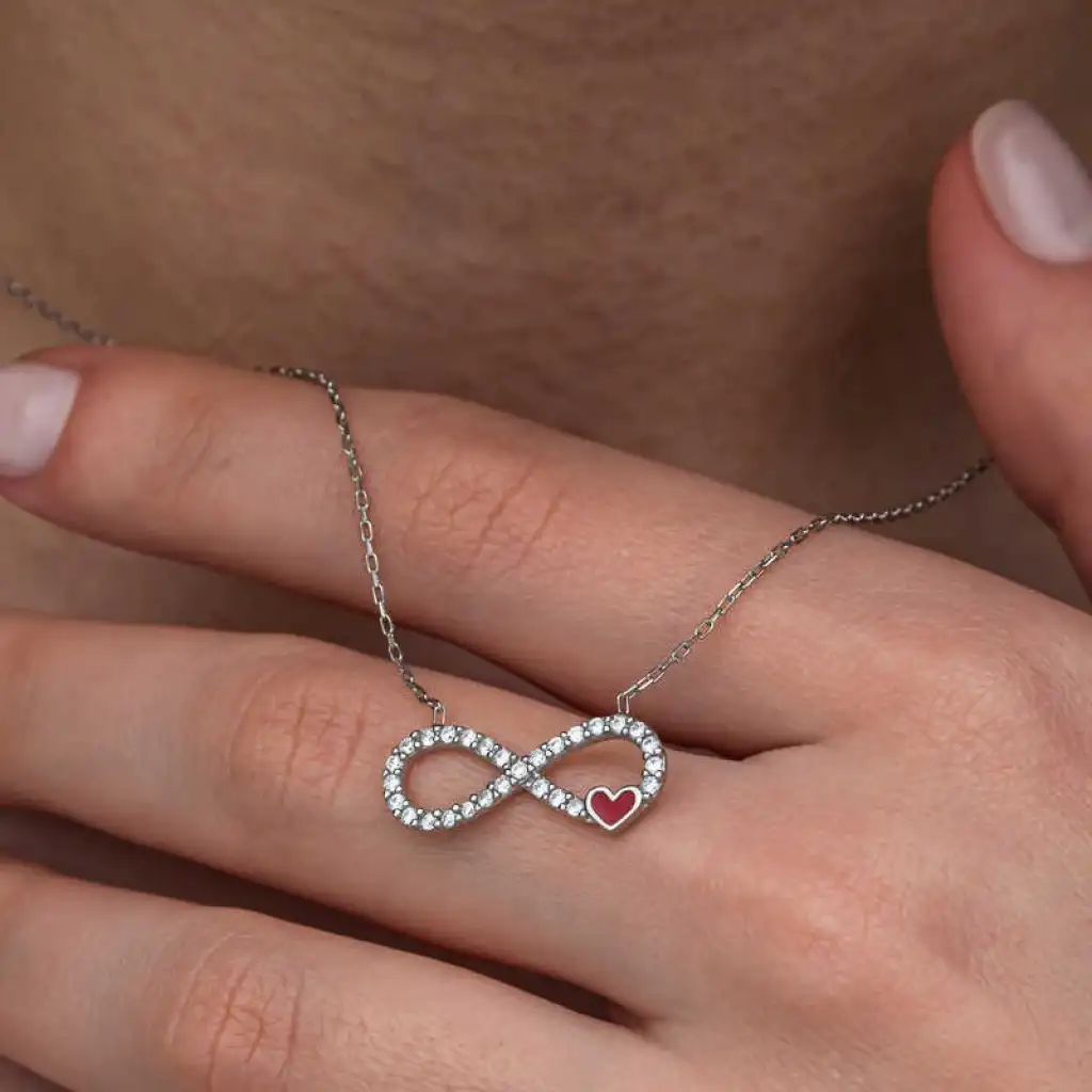 Gümüş Sonsuzluk Kırmızı Kalpli Kadın Kolye