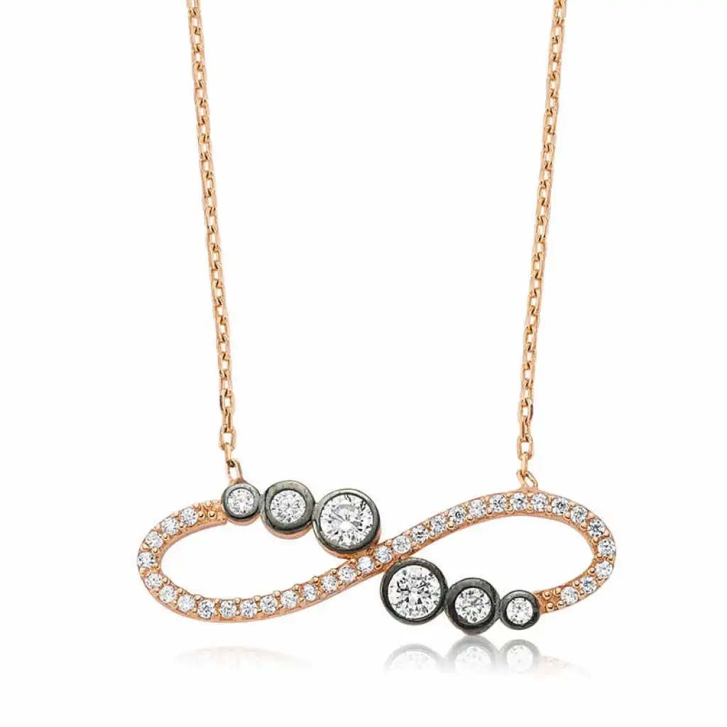 Sevgilinize sonsuz aşkı ifade etmenin en güzel en anlamlı yollarından biri de ona sonsuzluk temalı gümüş kolye hediye etmektir. Sevgilinize hediye edeceğiniz bu özel kolye ile ona olan sonsuz aşkınızı sevginizi ifade edebilir sonsuza kadar birlikte olacağınız mesajı verebilirsiniz. Gümüş süzme suyolu sonsuzluk bayan kolye 925 ayar gümüşten imal edilmiştir. Gümüş üzerine rose altın kaplama yapılmıştır. Rose altın kaplama yapılan gümüş bayan sonsuzluk kolye modelleri parlaklığını uzun süre muhafaza eder ve oksitlenmesi gecikir. Kolye üzerinde bulunan taşlar zirkondur. Gümüş olan zincir boyu ortalama 45 cm'dir. Tüm bayan kolye modellerinde olduğu gibi gümüş süzme suyolu sonsuzluk bayan kolye de el emeği ile üretilmiştir. Gümüş ve değerli taşlar nedeniyle belirtilen ürün ağırlığında ± %10 sapma olabilmektedir.