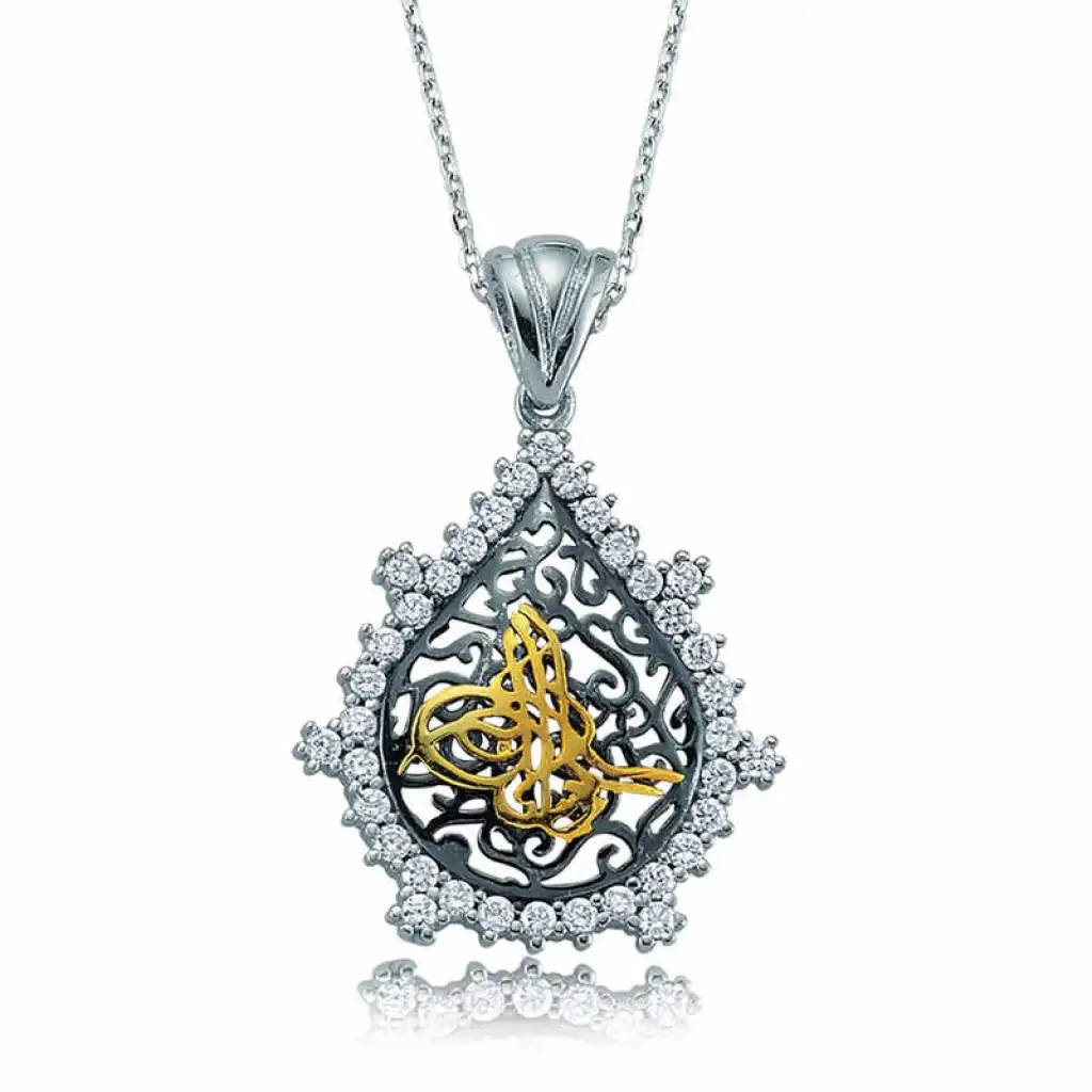 Tuğra, Osmanlı sultanlarının imzası anlamına gelir. Her tuğra; ona ait olan padişahın ismini, varlığını, hükümdarlığını ifade eder. Tuğra sembolü her padişaha göre farklı olmak üzere birçok şekilde günümüze ulaşmıştır. Tuğra Osmanlının her döneminde korunmuş, önemini hiç kaybetmemiştir. Ve zamanla hat sanatımızda da önemli bir yere sahip olup, günümüzde hattatlar tarafından sanatsal olarak yaşatılmaktadır. Bu mükemmel kolyeyi; doğum günü hediyesi, sevgililer günü hediyesi veya annelere hediye olarak özel günlerde tercih edebilirsiniz. Taşlı tuğra bayan kolye 925 ayar gümüşten imal edilmiştir. Gümüş üzerine oksit kaplama yapılmıştır. Oksit kaplama yapılan kolyeler parlaklığını uzun süre muhafaza eder. Üzerinde bulunan beyaz taşlar zirkondur. Tüm gümüş bayan kolyelerde olduğu gibi gümüş taşlı tuğra bayan kolye de el emeği ile üretilmiştir. Gümüş ve değerli taşlar nedeniyle belirtilen ürün ağırlığında ± %10 sapma olabilmektedir.