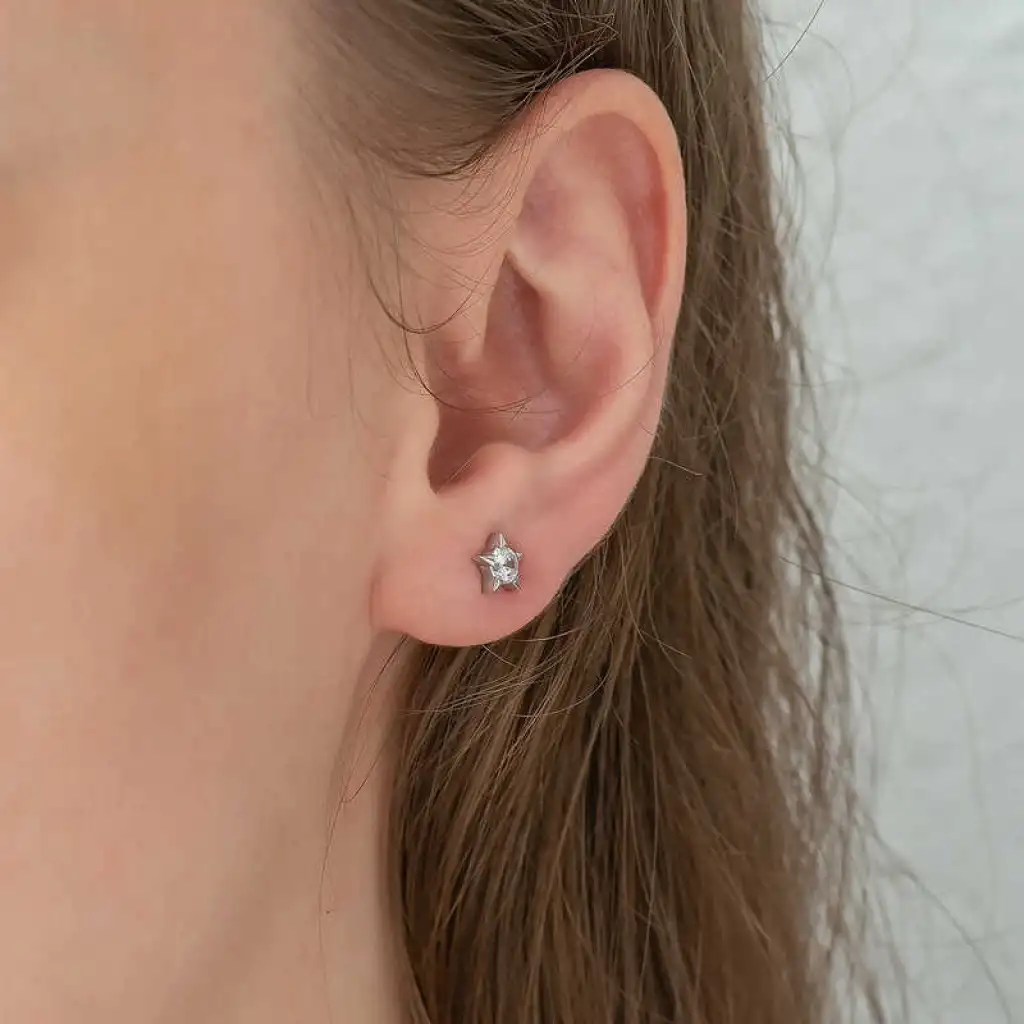 Gümüş Tek Taşlı Yıldız Çivili Bayan Küpe