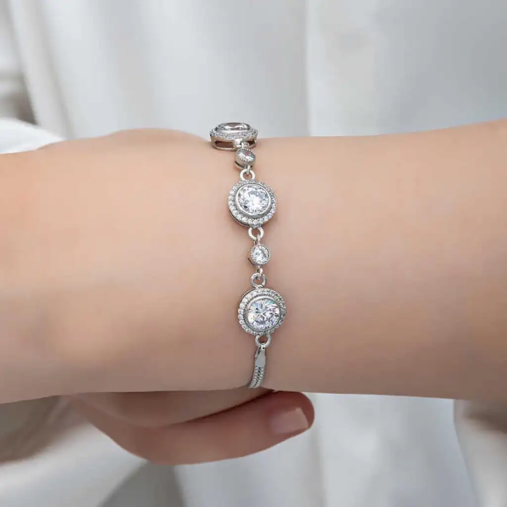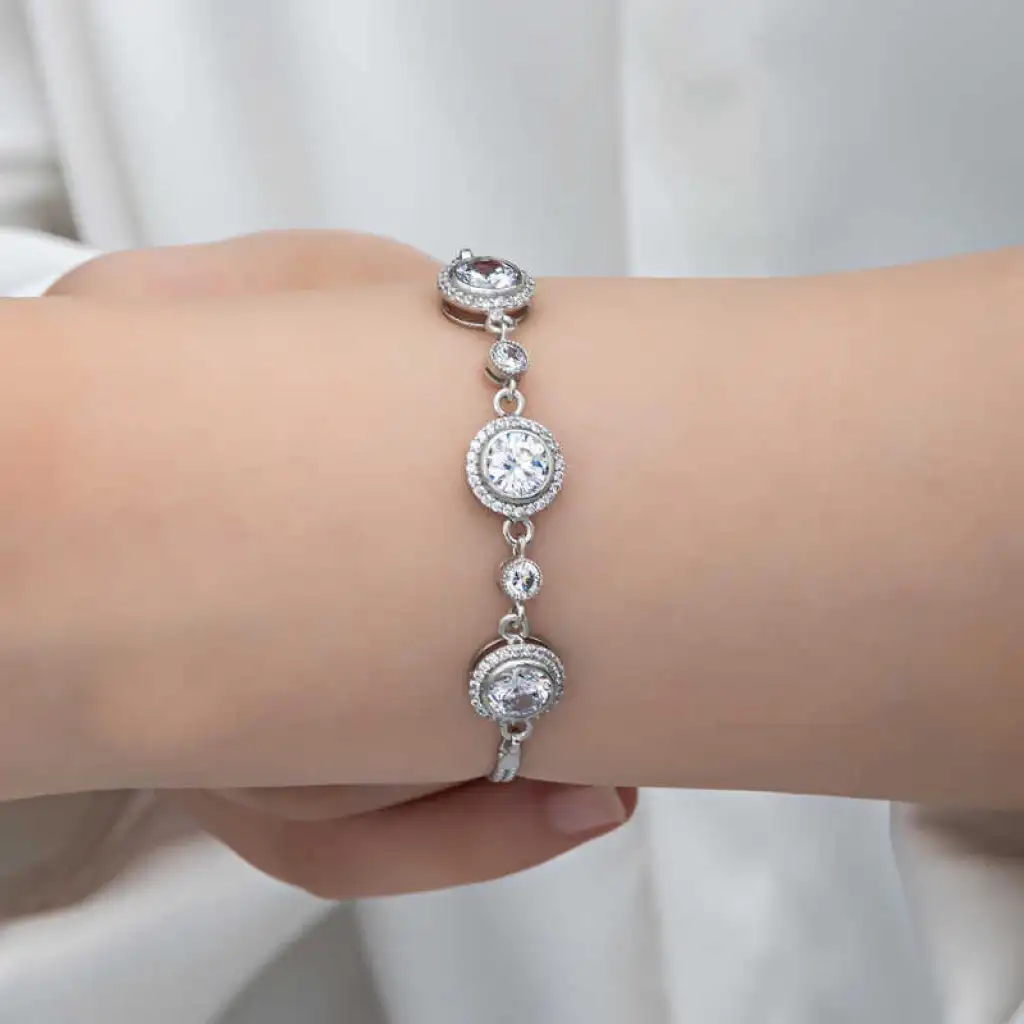 Gümüş ve zirkonun göz kamaştırıcı parlaklığı ile yıldızları anımsatmak isteyenlere bu tektaş bileklik çok yakışacak. 925 ayar gümüşten imal edilen bu bileklik hem sizin, hem de sevdiklerinizin keyifle takacağı spor ve klasik tüm kombinler için tercih edilebilir. Bileklik üzerindeki beyaz taş zirkondur. Dilerseniz kendinizi, dilerseniz sevdiklerinizi şık ve ışıl ışıl tek taş bileklik ile sevindirin. Gümüş tek taş kadın bileklik üzerine rodyum kaplama yapılmıştır. Rodyum kaplama yapılan tüm gümüş kadın bileklik modelleri parlaklığını uzun süre muhafaza eder. Bilekliğin zincir uzunluğu 21 cm dir. Tüm gümüş kadın bileklik modellerimizde olduğu gibi gümüş tek taş kadın bileklikte el emeği ile üretilmiştir. Gümüş ve değerli taşlar nedeniyle belirtilen ortalama ürün ağırlığında ± %10 sapma olabilmektedir.