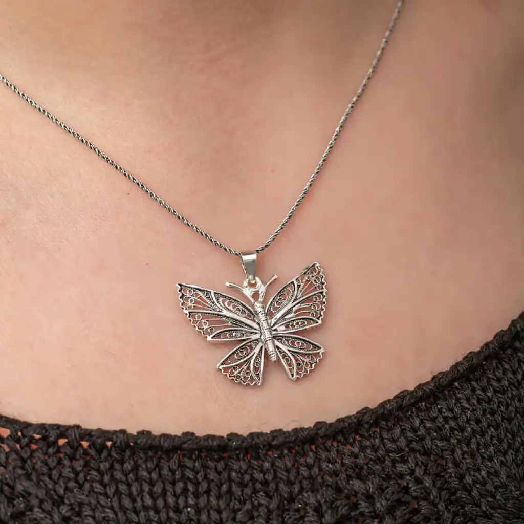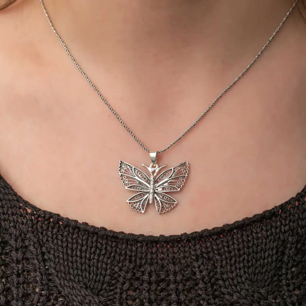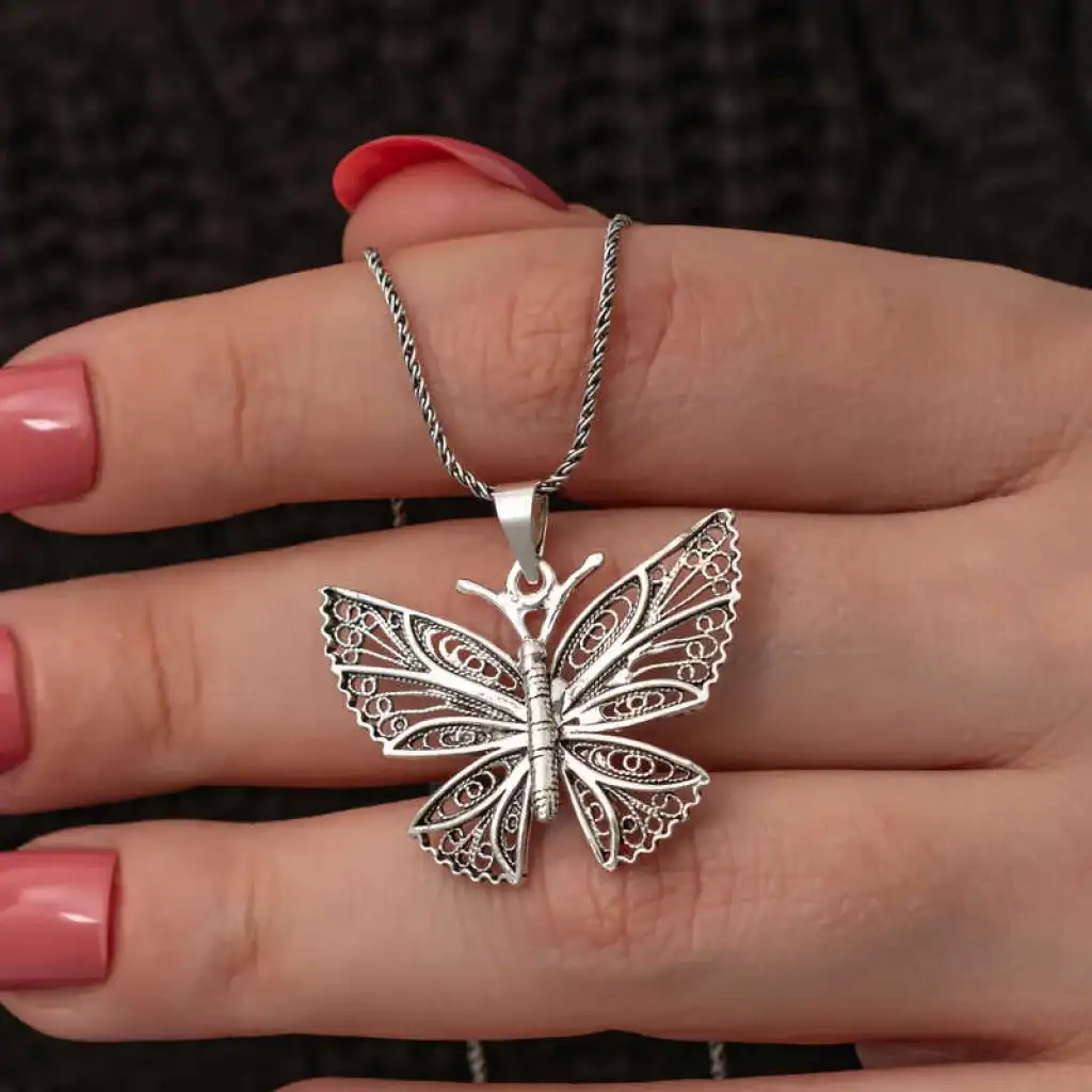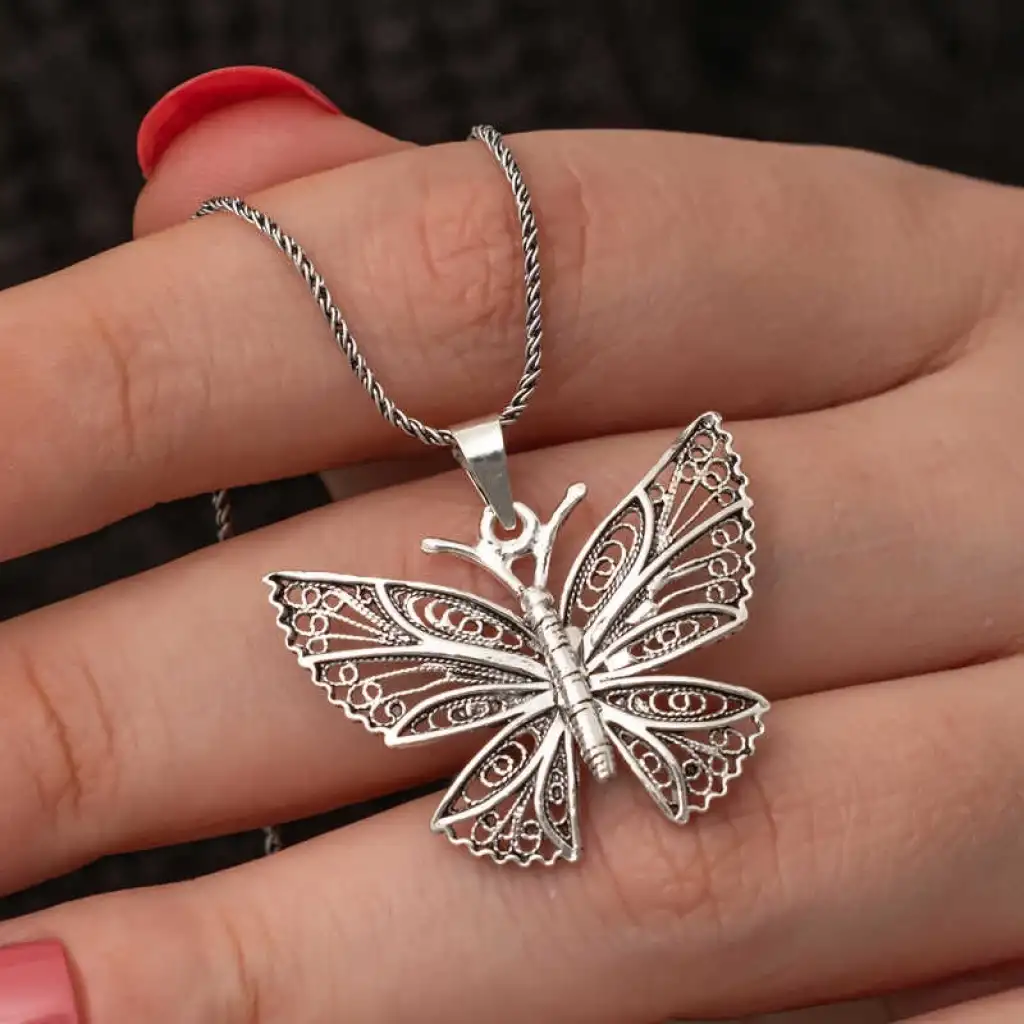 Özgürlüğü masumiyeti ve saflığı simgeleyen kelebekler, tertemiz sevginin ve aşkın ifadesidir. Bahar kelebekleri kolye anlam itibari ile aşkın küçük bir kıvılcım ile başladığı daha sonra büyük bir sabır ile büyüdüğü ve en sonunda ilan-ı aşkı ifade eder. Sizin olduğu kadar sevdiklerinizin de keyifle takacağı gümüş telkari kelebek kadın kolye en güzel hediyelerden biri olacaktır.Ürünlerimizin tamamı el emeği ile üretilmiştir. Gümüş ve değerli taşlar nedeniyle belirtilen ortalama ürün ağırlığında ± %10 sapma olabilmektedir.