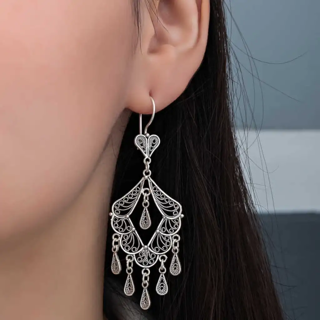 Bu özel tasarım el yapımı telkari sallantılı kadın küpe modeli 925 ayar gümüşten imal edilmiştir. Mardin telkarisi olarak da bilinen küpe modeli, gümüş teller kıvrılarak el işçiliği ile hazırlanmıştır. Gümüş telkari sallantılı kadın küpe modelini sevgilinize veya tüm sevdiklerinize, doğum gününde, yıl dönümünüzde, yılbaşında ve sevgililer gününde hediye edebilirsiniz. Gümüş ve değerli taşlar nedeniyle belirtilen ortalama ürün ağırlığında ± %10 sapma olabilmektedir.