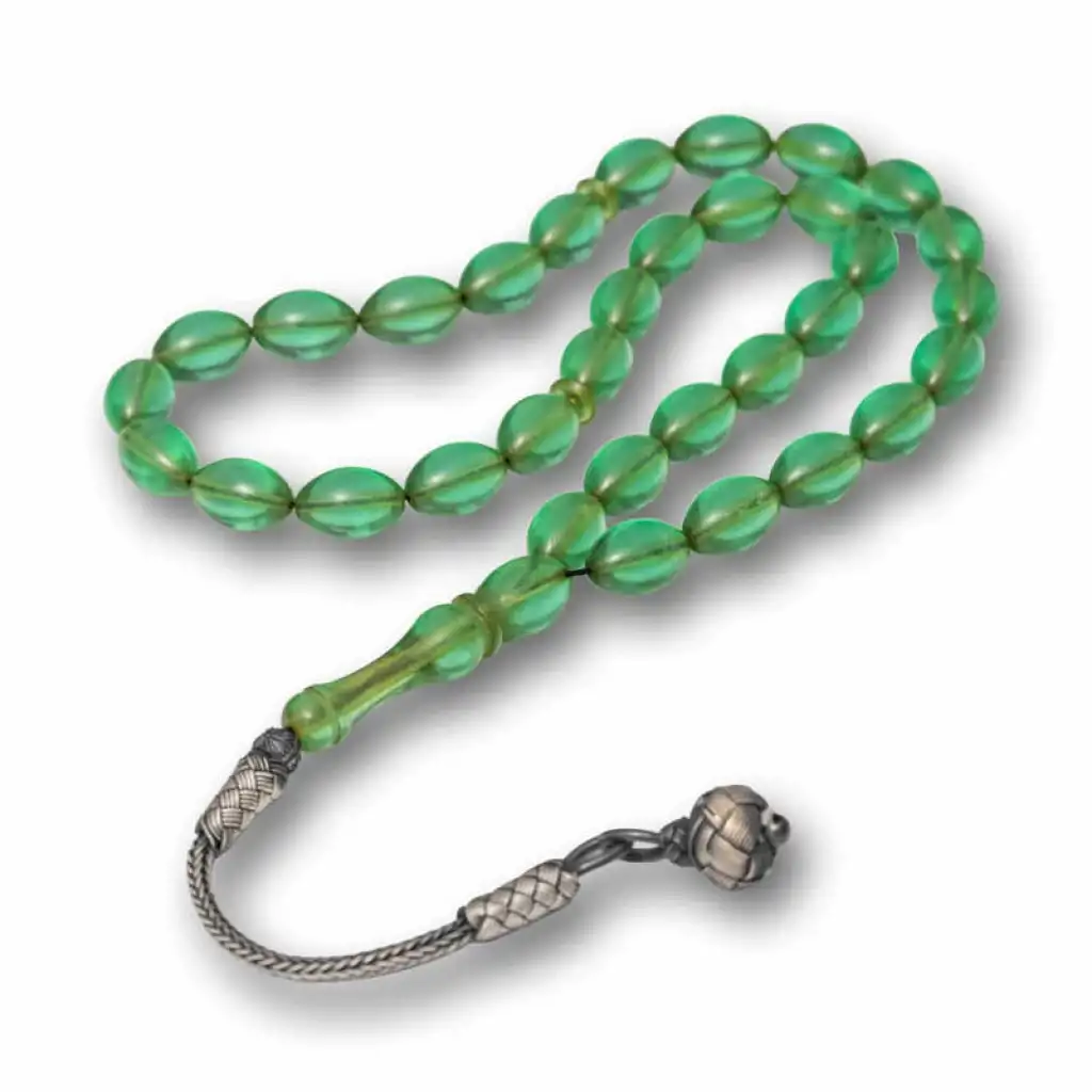 Gümüş Top Kazaz Püsküllü Yeşil Sıkma Kehribar Tesbih