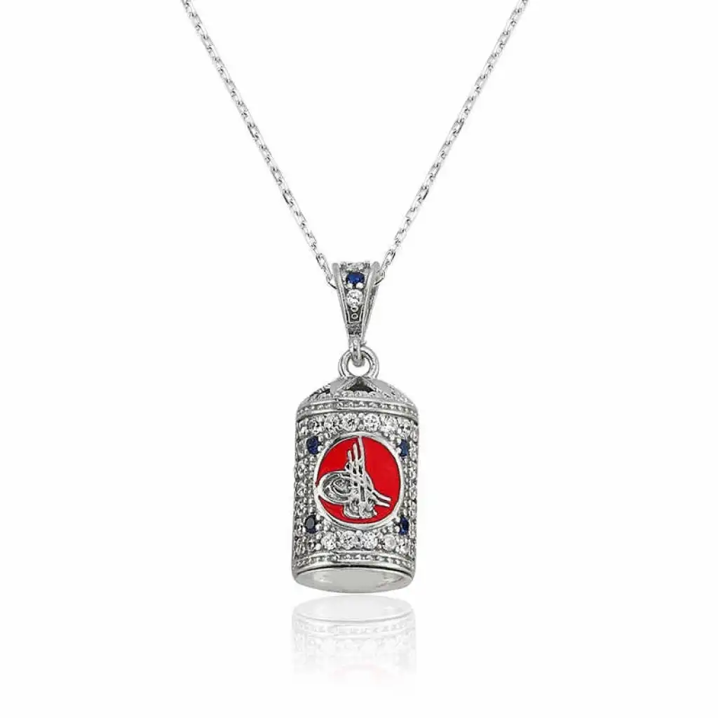 Osmanlı Devleti ve İmparatorluğu'ndaki padişahların imza olarak da kullandığı tuğra sembolü cevşen kolye ile birleşerek hem anlamı hem de dini boyutu ile güzel bir kolye haline gelmiştir. Böylelikle sevdiklerinizi veya kendinizi dini ve derin bir anlama sahip olan bu kolye ile sevindirebilirsiniz. Bu şık kolye modeli 925 ayar gümüşten imal edilmiştir. Gümüş üzerine rodyum kaplama yapılmıştır. Rodyum kaplama yapılan gümüş cevşenler parlaklığını uzun süre muhafaza eder, oksitlenmesi gecikir. Üzerinde bulunan taşlar zirkondur. Zincir boyu ortalama 45 cm'dir. Ürünlerimizin tamamı el emeği ile üretilmiştir. Gümüş ve değerli taşlar nedeniyle belirtilen ortalama ürün ağırlığında ± %10 sapma olabilmektedir.