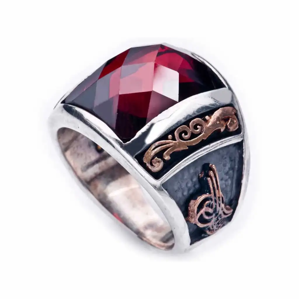 Tuğra, Osmanlı sultanlarının imzası anlamına gelir. Her tuğra; ona ait olan padişahın ismini, varlığını, hükümdarlığını ifade eder. Tuğra sembolü her padişaha göre farklı olmak üzere birçok şekilde günümüze ulaşmıştır. Tuğra Osmanlının her döneminde korunmuş, önemini hiç kaybetmemiştir. Ve zamanla hat sanatımızda da önemli bir yere sahip olup, günümüzde hattatlar tarafından sanatsal olarak yaşatılmaktadır. Bu sanatı yansıtan gümüş yüzüğü severek kullanabilir ve sevdiklerinize hediye edebilirsiniz. Gümüş tuğralı erkek yüzük 925 ayar gümüşten imal edilmiştir. Üzerinde bulunan taş zirkondur. Tuğralı yüzük gümüş üzerine oksit kaplama yapılmıştır.Tüm gümüş erkek yüzüklerde olduğu gibi gümüş tuğralı erkek yüzüğünde tamamı el emeği ile üretilmiştir. Gümüş ve değerli taşlar nedeniyle belirtilen ortalama ürün ağırlığında ± %10 sapma olabilmektedir.