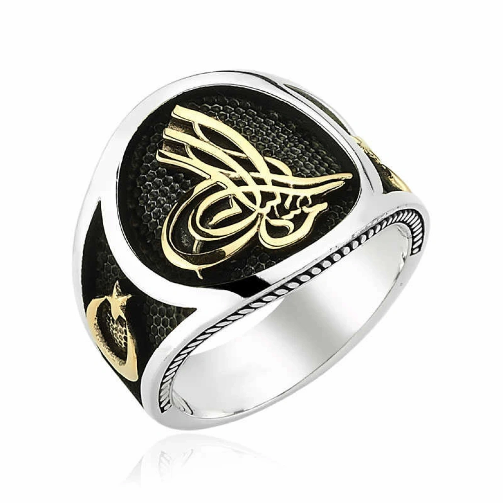 Tuğra, padişahın ismi ve lakabı bulunan alâmet, imza.Tuğra, hat sanatının bir kolu halinde yüzyıllar boyunca usta hattatlar eliyle yazılmıştır. Türkçe’de kelime olarak padişahın ismini ihtiva eden özel bir işaret, padişahın imzası gibi anlamlar ifade eder. Aslı Oğuz lehçesinde tuğra olup, hükümdarın basılmış imzası demektir. Orhan Gazi tarafından kullanılan ilk tuğra Orhan bin Osman ifâdesinden ibâret olup, tuğralardan ilki 1324 diğeri 1348 tarihlidir. Birinci Sultan Osman Gazi'ye ait bir tuğraya günümüze dek hiçbir yerde rastlanmamıştır. Bu nedenle 36 Osmanlı padişahı; ama 35 Osmanlı padişah tuğrası vardır. Padişahın kendisi ve babasının isminin yazıldığı kısma, taht, kürsü veya sere adı verilir. Buradan sola doğru uzanarak aşağıdan yukarıya doğru uzayan ve iç içe iki kavisten meydana gelen kısma ise, beyze veya sancak adı verilir. Osmanlı imparatorluğunu simgeleyen Tuğra armalı yüzüğü severek kullanabilir ve sevdiklerinize armağan edebilirsiniz. 925 ayar gümüşten imal edilmiştir. Gümüş üzerine rodyum kaplama yapılmıştır. Rodyum kaplama yapılan ürünler parlaklığını uzun süre muhafaza eder, oksitlenmesi gecikir. Gümüş tuğra armalı yüzük ve diğer ürünlerimizin tamamı el emeği ile üretilmiştir. Gümüş ve değerli taşlar nedeniyle ürün ağırlığında ± %10 sapma olabilmektedir.