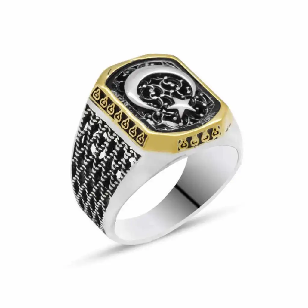 Türk bayrağının ilhamını da kan gölüne yansıyan ay ve yıldızdan aldığını biliyoruz. Bayrağın taşıdığı kutsal anlamı taşımak ve sevdiklerinizle paylaşmak için kaçırılmayacak bir fırsat sunuyoruz. Bu şık tasarım erkek yüzük modeli kendinize alabileceğiniz gibi sevdiklerinize doğum gününde, babalar gününde ya da özel günlerde hediye edebilirsiniz. Türk bayrağı ay yıldız erkek yüzük modeli 925 ayar gümüşten imal edilmiştir. Gümüş üzerine oksit kaplama yapılmıştır. Tüm gümüş erkek yüzüklerinde olduğu gibi gümüş Türk Bayrağı ay yıldız erkek yüzük modeli de tamamen el emeği ile üretilmiştir. Gümüş ve değerli taşlar nedeniyle belirtilen ortalama ürün ağırlığında ± %10 sapma olabilmektedir.