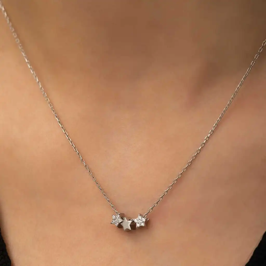 Yıldız, pek çok toplumda ve öğretide şans getirildiğine inanılan uğurlu bir semboldür. Venüs Gezegeninin enerjisini taşır. Venüs Gezegeni, aşk ve aşk enerjisinin de temsilcisidir. Bu şık kolye; doğum günü hediyesi, sevgililer günü hediyesi veya annelere hediye olarak özel günlerde tercih edilebilecek mükemmel bir seçenektir. Gümüş üç yıldız bayan kolye 925 ayar gümüşten imal edilmiştir. Bu kolye üzerinde rodyum kaplama vardır. Rodyum kaplama yapılan gümüş bayan kolye modelleri parlaklığını uzun süre muhafaza eder. Tüm gümüş bayan kolye modellerimizde olduğu gibi gümüş üç yıldız bayan kolye modeli de el emeği ile üretilmiştir. Gümüş ve değerli taşlar nedeniyle belirtilen ortalama ürün ağırlığında ± %10 sapma olabilmektedir.