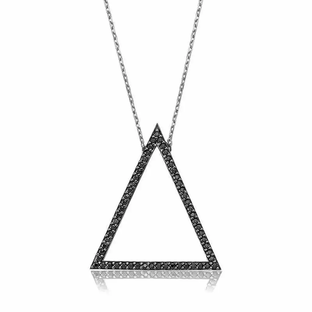 Şık ve sade tasarımıyla günlük hayatta ya da özel günlerde kullanabileceğiniz çok şık bir model olan üçgen kadın kolye 925 ayar gümüşten imal edilmiştir. Gümüş üzerine rodyum kaplama yapılmıştır. Rodyum kaplama yapılan gümüş kadın kolye modelleri parlaklığını uzun süre muhafaza eder ve oksitlenmesi gecikir. Kolye üzerinde bulunan taşlar zirkondur. Gümüş olan zincir boyu ortalama 45 cm'dir. Tüm kadın kolye modellerinde olduğu gibi gümüş üçgen kadın kolye modeli de el emeği ile üretilmiştir. Gümüş ve değerli taşlar nedeniyle belirtilen ürün ağırlığında ± %10 sapma olabilmektedir.