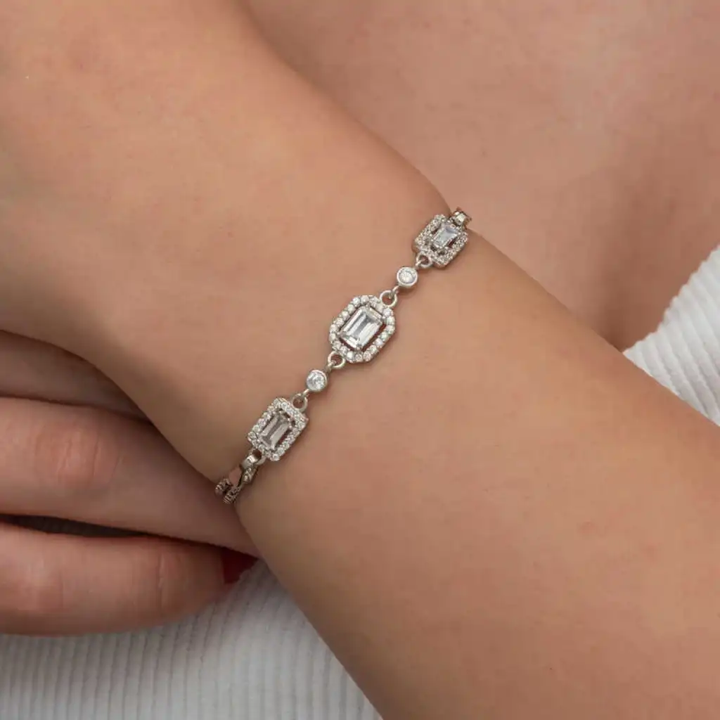 Üçlü baget taşlı kadın bileklik, şıklığı ve zarafeti bir araya getiren bir aksesuar türüdür.Bu bileklik, hem günlük kullanımda hem de özel günlerde rahatlıkla tercih edilebilecek bir aksesuardır. Farklı stillerle kombinlenebilir ve birçok kıyafetle uyum sağlar. Gümüş üzerine rodyum kaplama yapılmıştır. Rodyum kaplama yapılan kadın bileklik modelleri parlaklığını uzun süre muhafaza eder. Gümüş ve değerli taşlar nedeniyle belirtilen ortalama ürün ağırlığında ± %10 sapma olabilmektedir.
