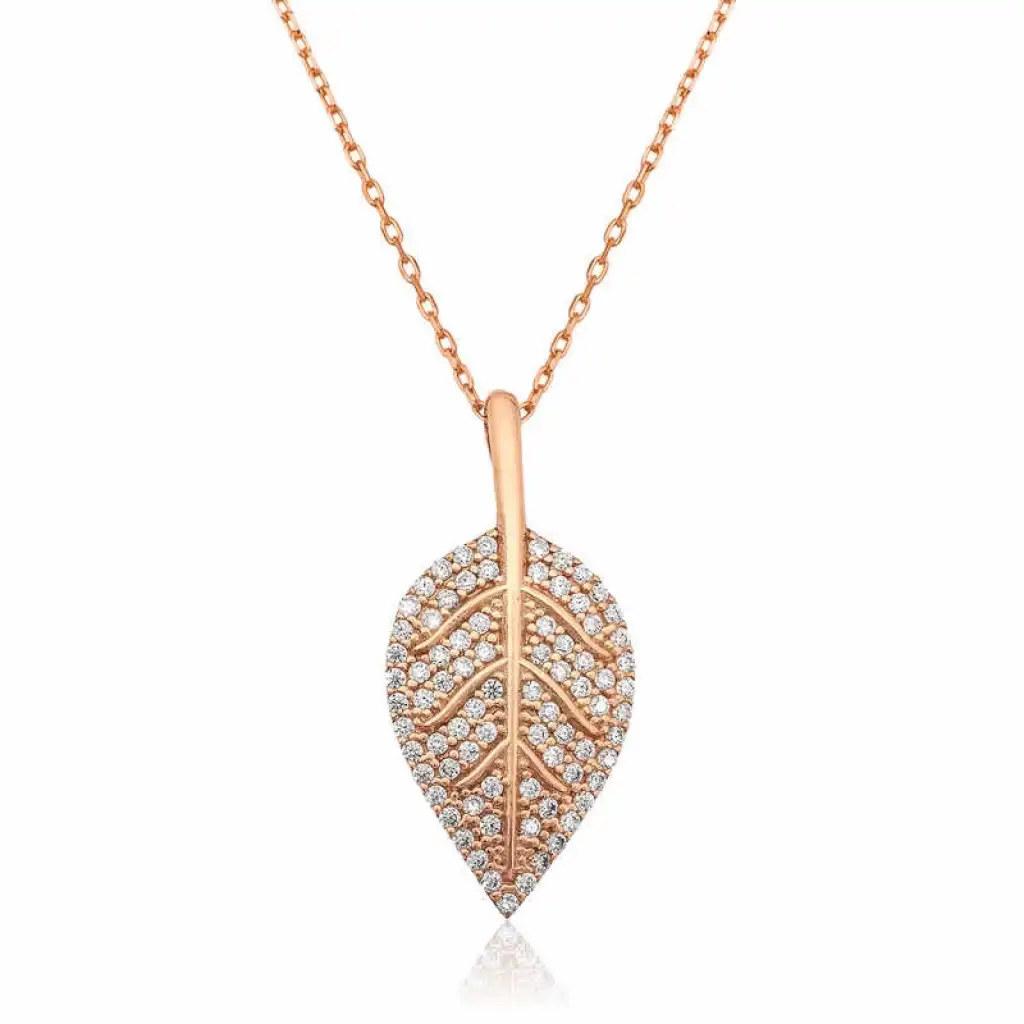 Yaprak deseni tabiattan almakta olduğu kuvveti, saygıyı ve zarafeti simgeler. ''Güçlüyüm ve yeniden doğmayı bilirim'' imajı çizmektedir ve evrene olan saygıyı belirtmektedir. Çiçekler ve bununla birlikte yapraklar, insanoğluna tabiatın verdiği en güzel hediyelerdendir. Doğanın verdiği bu bereketli hediyeyi sevdiklerinizle paylaşmaya ne dersiniz? Gümüş yaprak bayan kolye sevdiklerinizin teninde hayat bulsun. Yaprak bayan kolye; 925 ayar gümüşten imal edilmiştir. Gümüş üzerine rose altın kaplama yapılmıştır. Rose altın kaplama yapılan ürünler parlaklığını uzun süre muhafaza eder, gümüşü pembe renge çevirir ve oksitlenmeyi geciktirir. Diğer gümüş kolyelerde olduğu gibi gümüş yaprak bayan kolye de tamamı el emeği ile üretilmiştir. Üzerinde bulunan taşlar zirkondur. Gümüş ve değerli taşlar nedeniyle belirtilen ortalama ürün ağırlığında ± %10 sapma olabilmektedir.