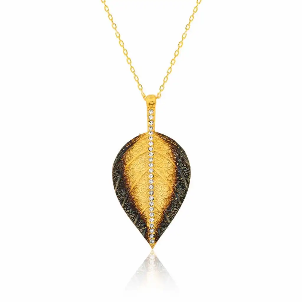 Gençlere ve kendisini genç hisseden tüm bayanlara özel; gümüş ve beyaz zirkon taşın ışıltısı ile yaşam enerjinizi etrafınıza yansıtın. Sizin olduğu kadar sevdiklerinizin de keyifle takacağı bu kolye modeli, sevdiğinize verilebilecek en güzel hediyelerden biri olacaktır. Bu yaprak desenli bayan kolye 925 ayar gümüşten imal edilmiştir. Gümüş üzerine altın kaplama yapılmıştır. Altın kaplama yapılan gümüş bayan kolye modelleri parlaklığını uzun süre muhafaza eder ve oksitlenmesi gecikir. Gümüş bayan kolye üzerinde bulunan taşlar zirkondur. Gümüş olan zincirin boyu ortalama 45 cm'dir. Tüm gümüş bayan kolye modellerinde olduğu gibi bu gümüş yaprak bayan kolye modeli de el emeği ile üretilmiştir. Gümüş ve değerli taşlar nedeniyle belirtilen ortlama ürün ağırlığında ± %10 sapma olabilmektedir.